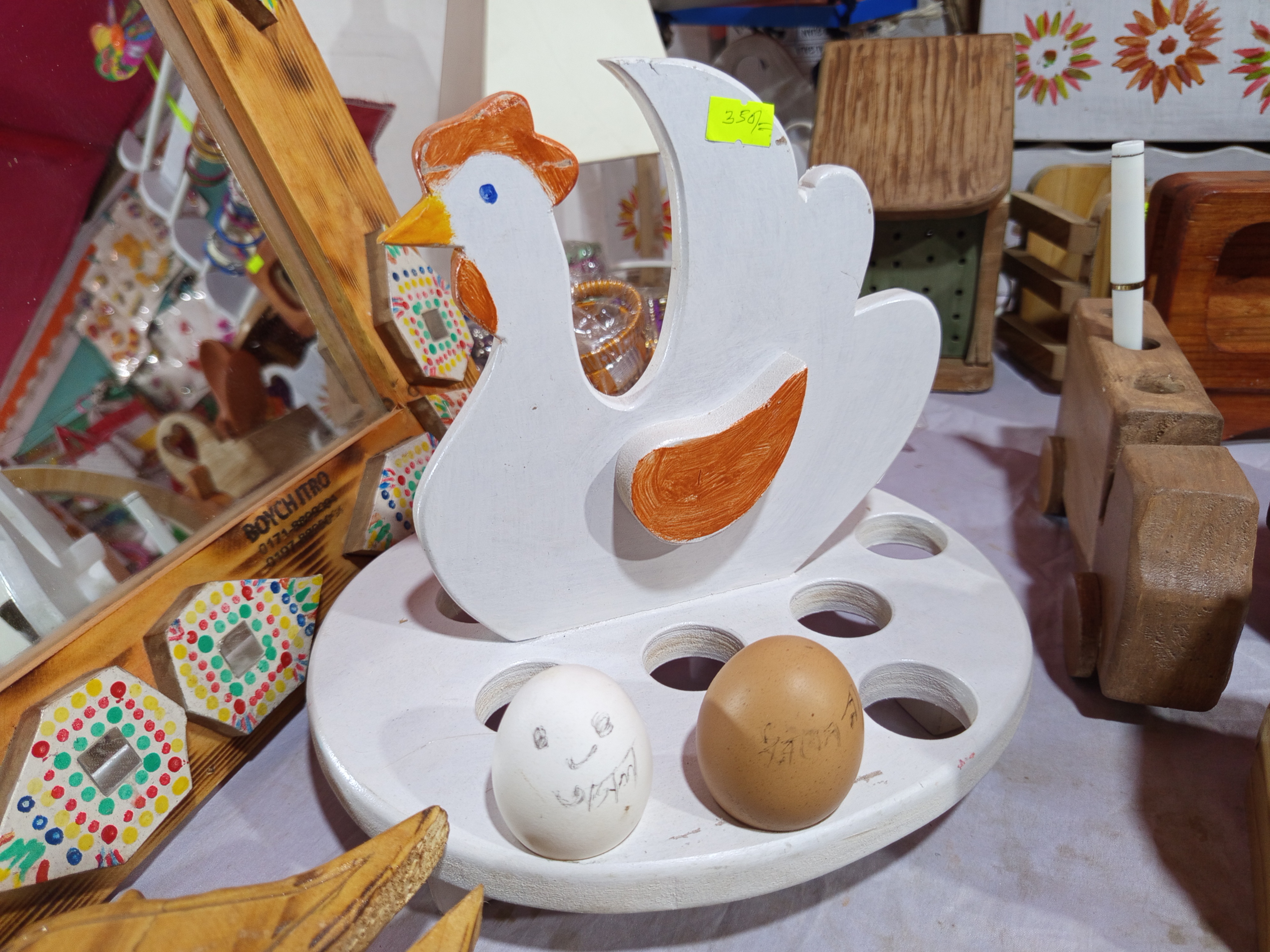 I was quite impressed by the wooden shoes and chickens that exist here. Anyway, the wooden chicken you see here is basically a demo, the main story is that it's a cage for laying eggs. You can see here that the eggs are placed next to the chicken, making the round bowl the perfect place to lay the eggs. Also, the other products here were quite elegant. We have published the names and price lists of some of the products below.