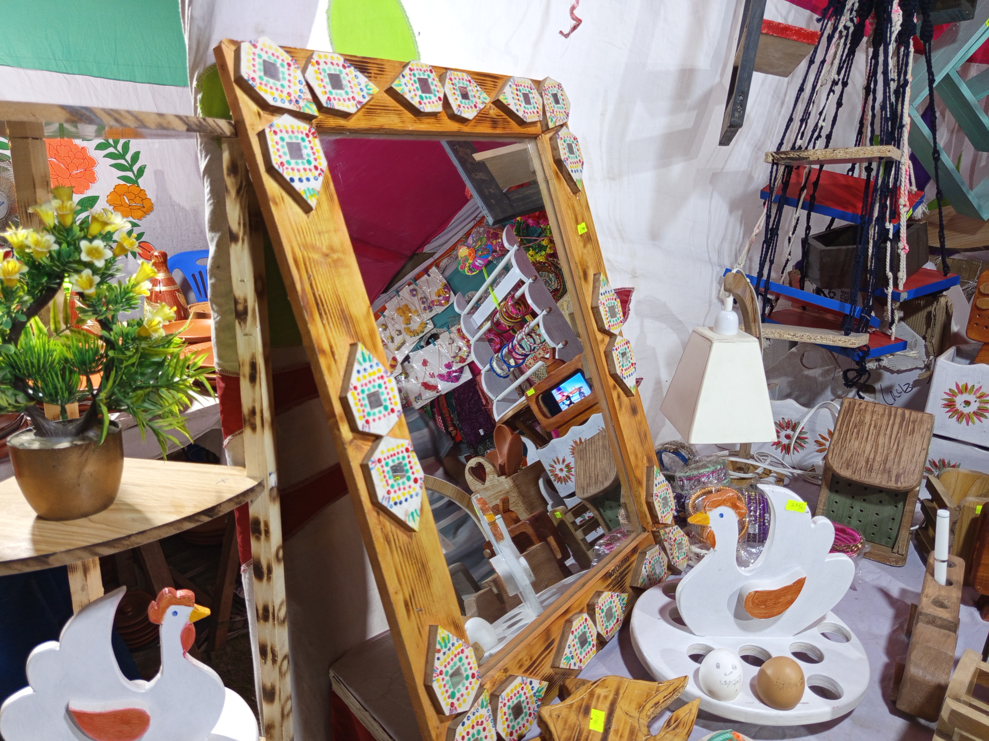 Here I noticed a mirror in an attractive wooden framing. I was fascinated by the beauty of the mirror in its wooden framing. The reason I'm particularly impressed by these wooden mirror frames is that they are very clear and uniquely crafted. All of this was made of wood. This is the perfect season to frame these wooden items and mirrors. I really liked this clear flat mirror. The small wooden carvings around the mirror are especially beautifully reflected. I also saw the scenes reflected on this mirror. I can directly see the other products in the store through the mirror's photography. The picture clearly depicts that.