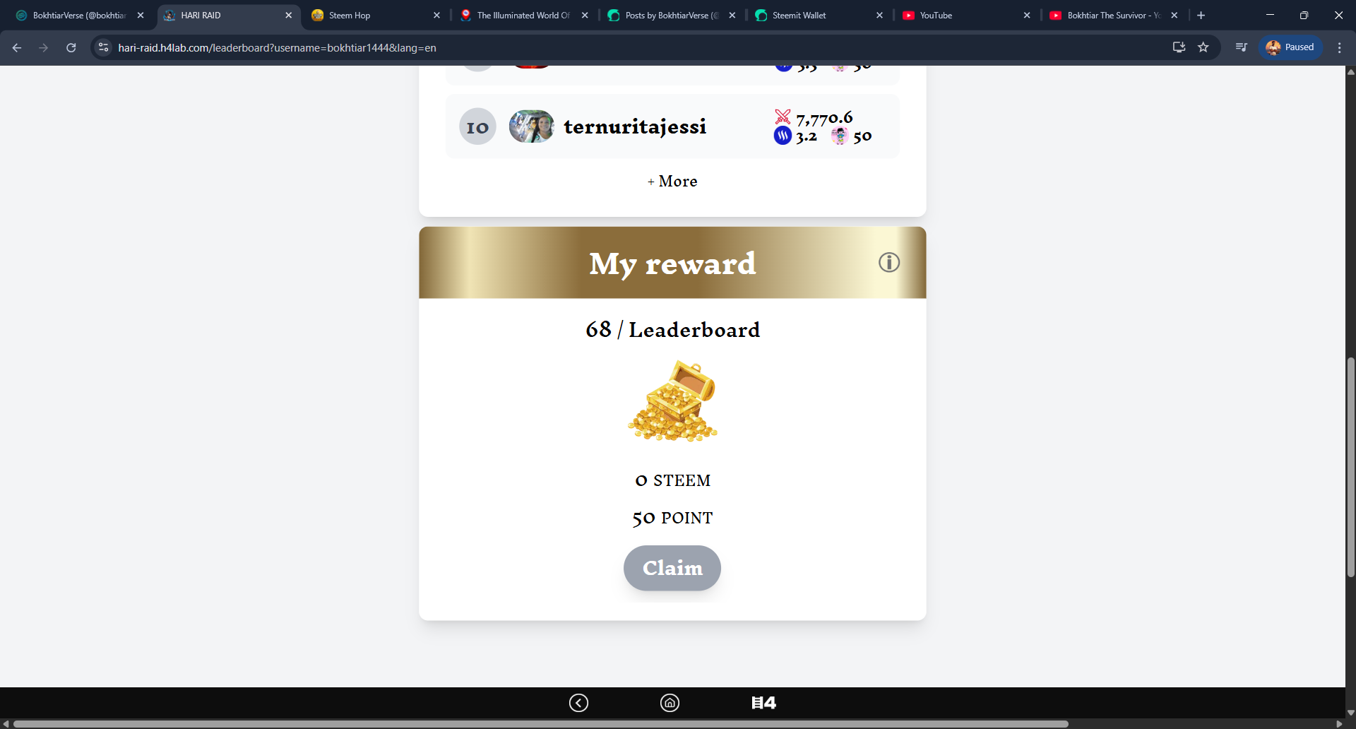 After coming to the home page I collect 8 points from daily quests, then I go to the leaderboard and see my rank is 68 and from there I get the opportunity to collect fifty points.