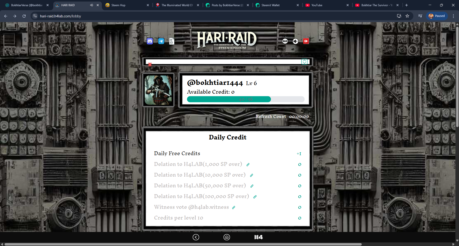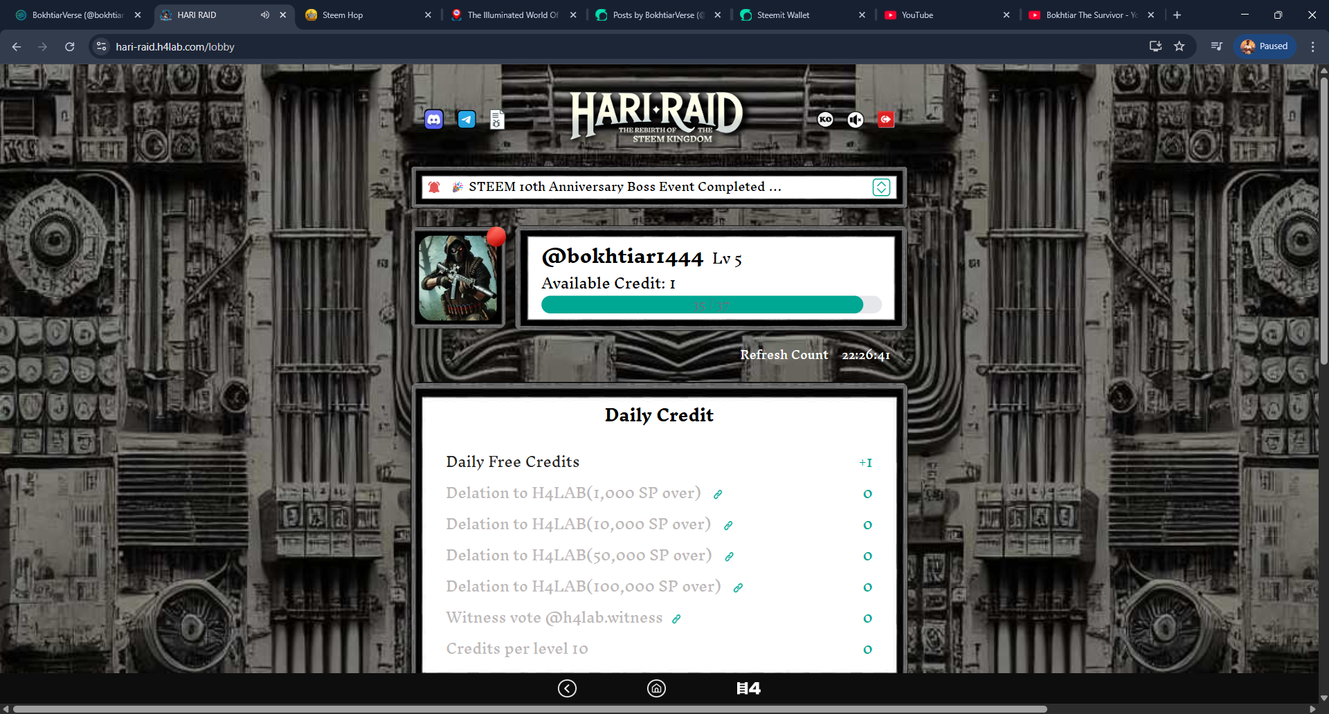 First I enter the game and after entering I see that I am currently level five and I have 1 credit.