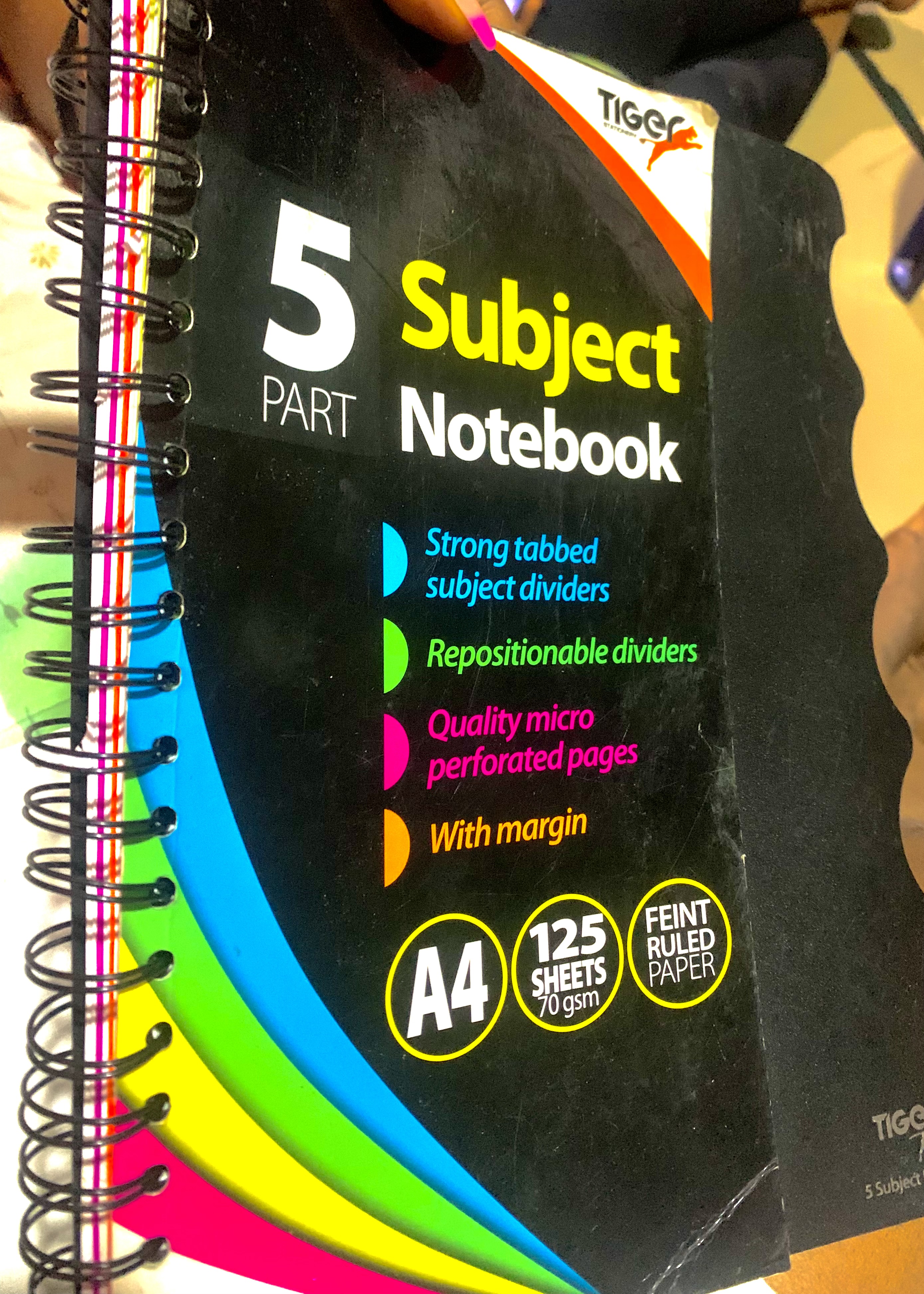 Using a notebook like the one in my image (a 5-part subject notebook, captured with my phone camera, iPhone XR) can enhance the organization of your entries, as it allows you to divide your journal into sections, each dedicated to different themes or topics.