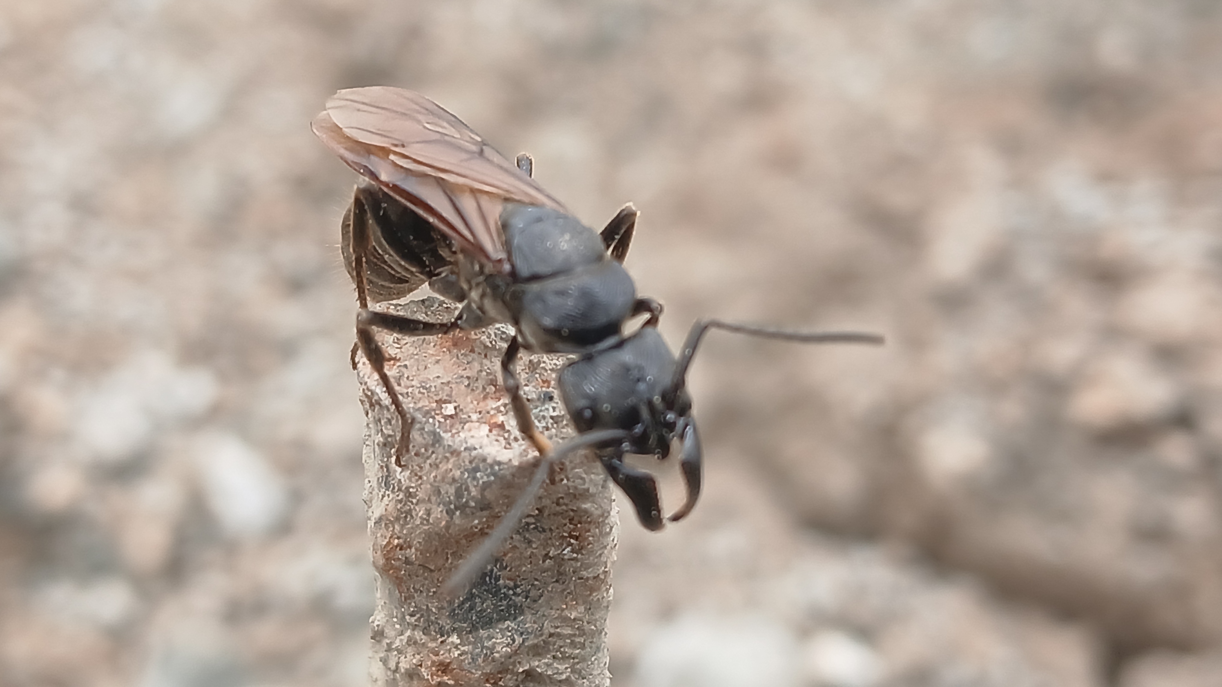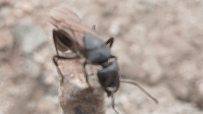 Most of the time I see them in the farm, they have lost their wings but this one could still fly; most likely a new queen looking for a place to call home.