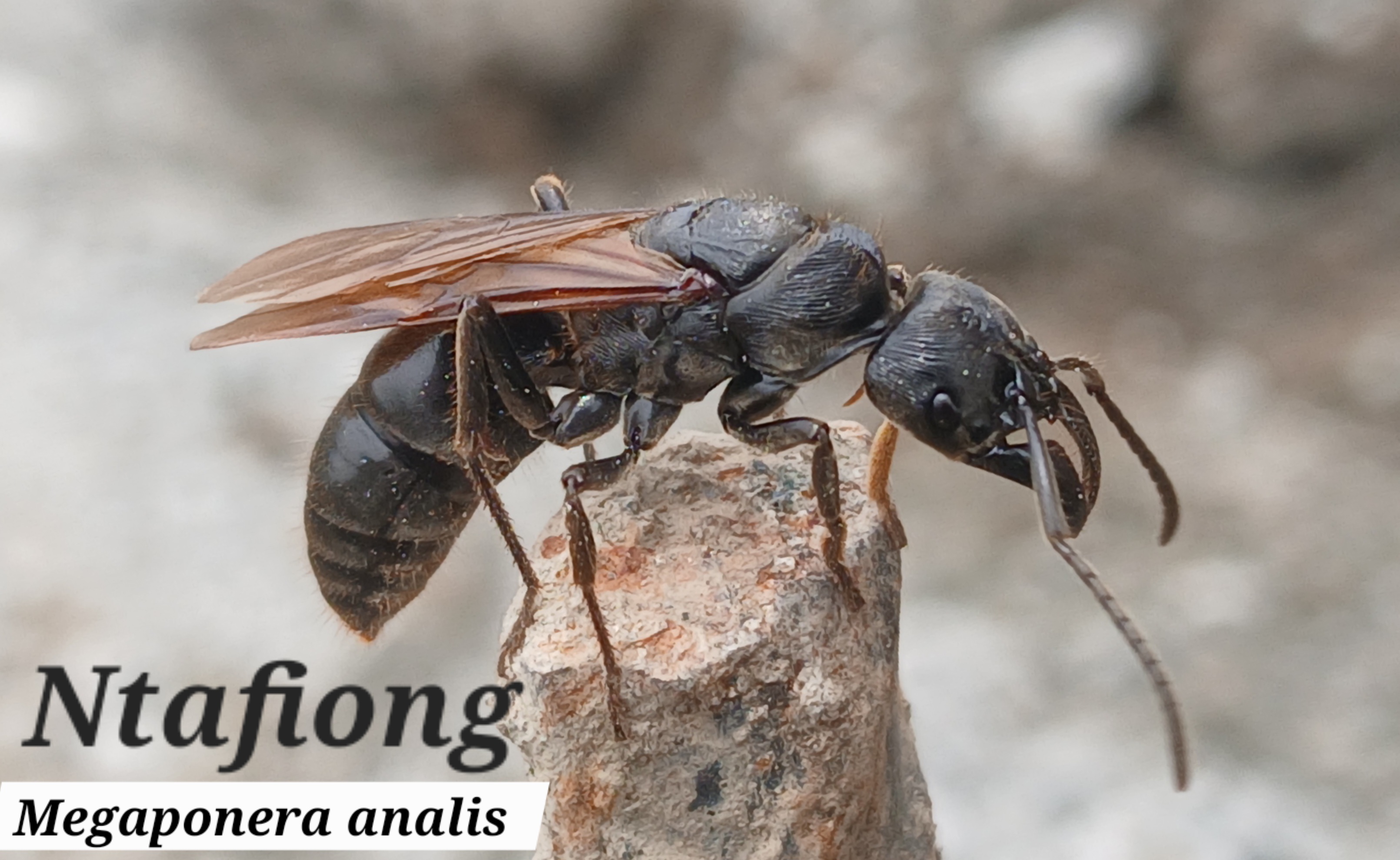 Ntafiong is one of the largest species of ant I have ever seen, it's up to 1 inch, but if you include its antenna, it will be a little more than one inch. I think I am not the only one who feels this particular ant is bigger than usual. Its scientifically recognised name is Megaponera analis, did you get the mega in it? That is likely because of its massive size.