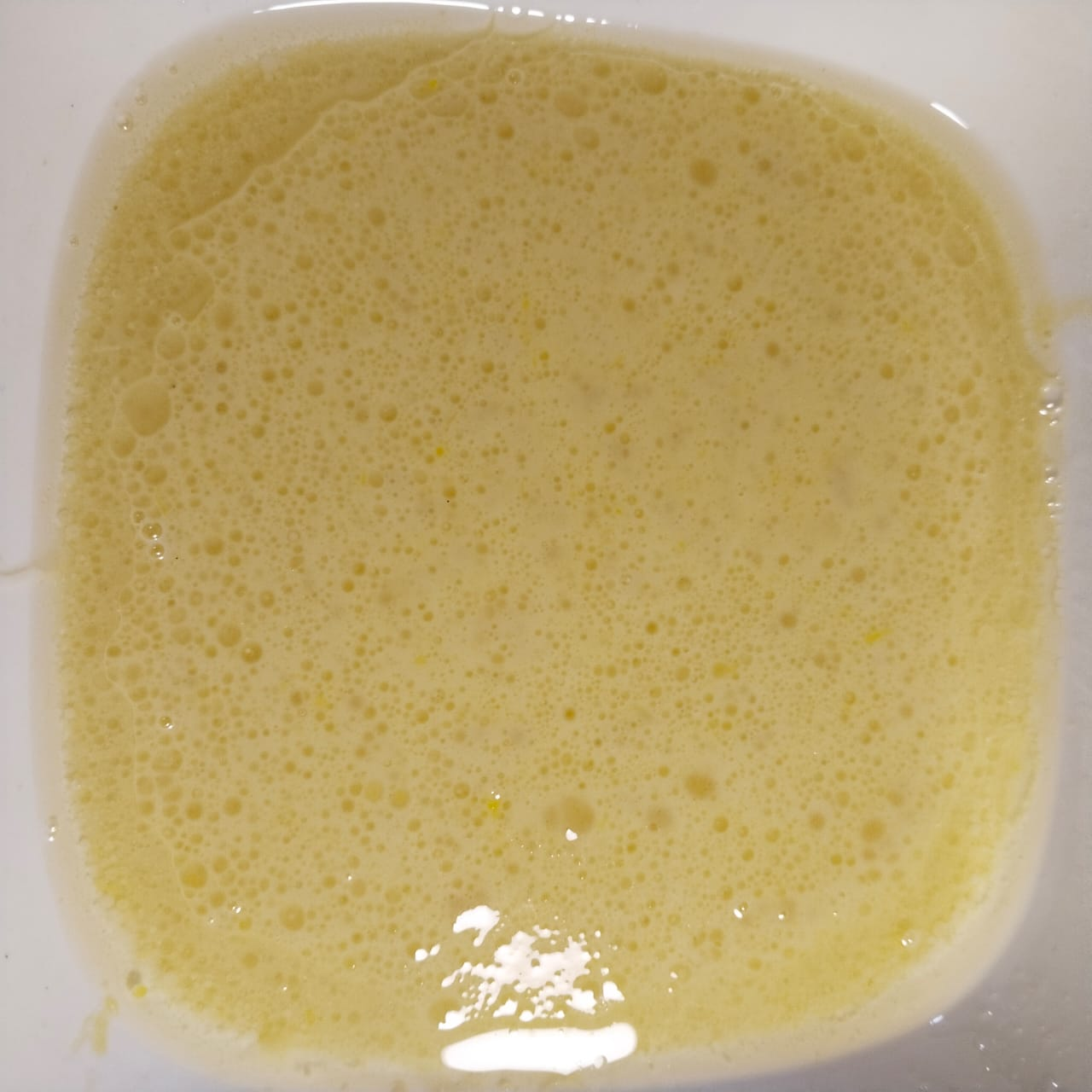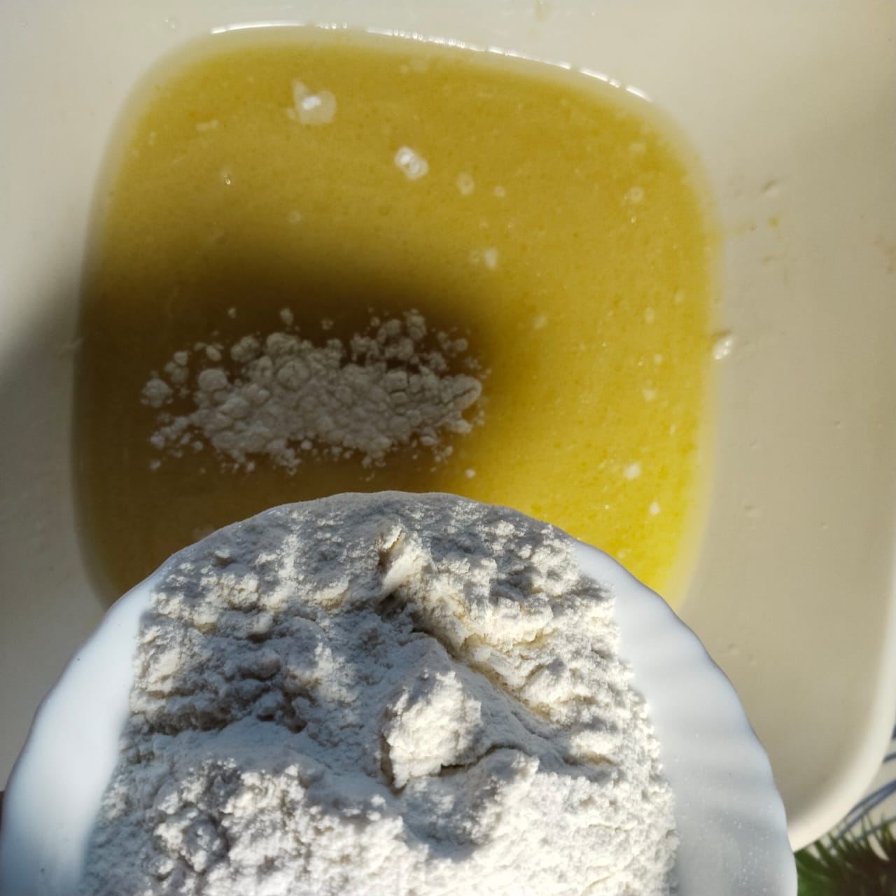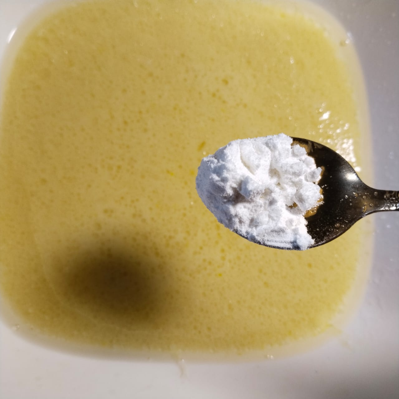Step-2: After 10 minutes, add oil and egg and beat with a hand whisk for some time. Then add baking powder and salt to it.