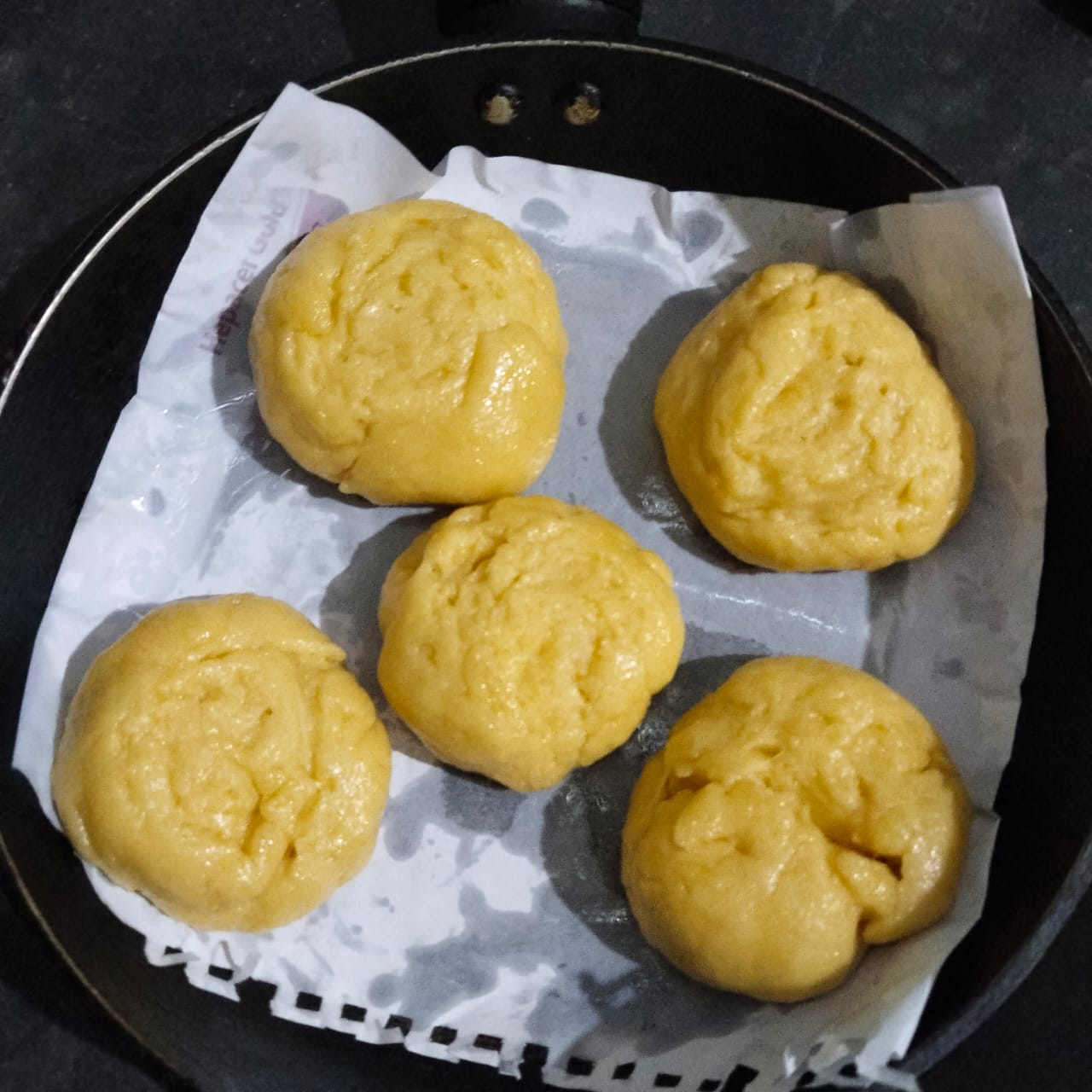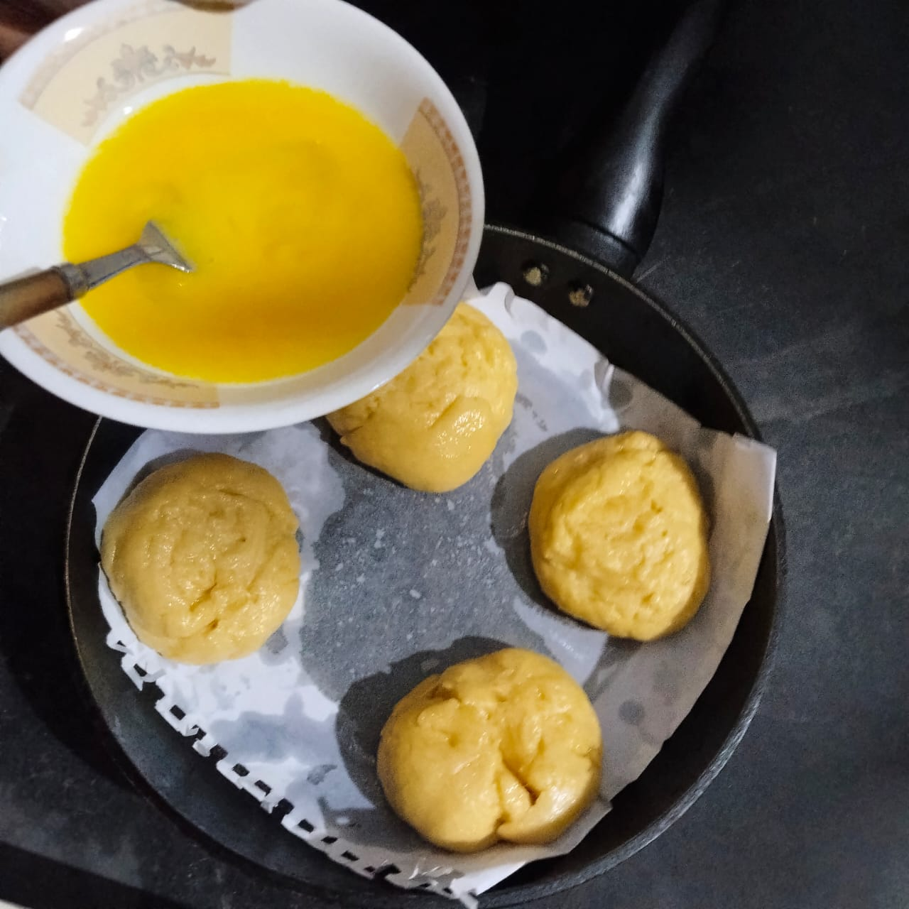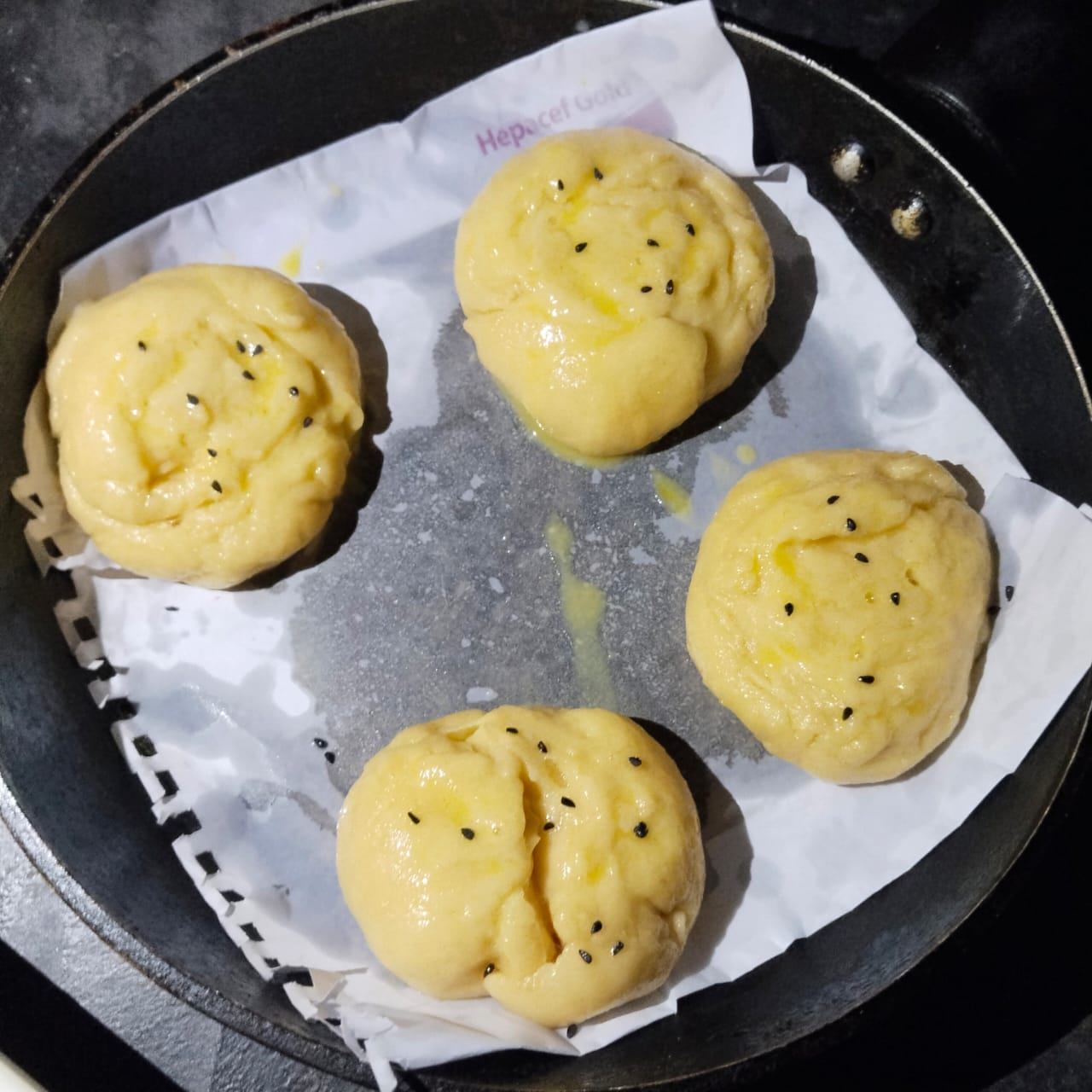 Step-6: Grease a paper with oil in a pan and then put the round buns on it, when serving I lightly brush it with egg and sprinkle some black cumin seeds on it. Then I cook it on low heat for 20 minutes. Since I don't have a microwave, I make it on the stove.