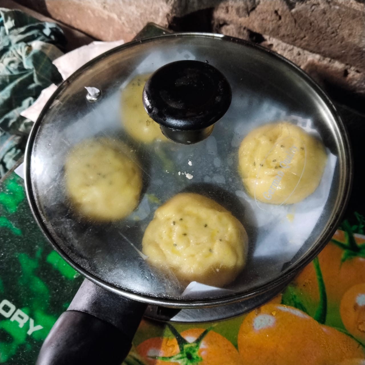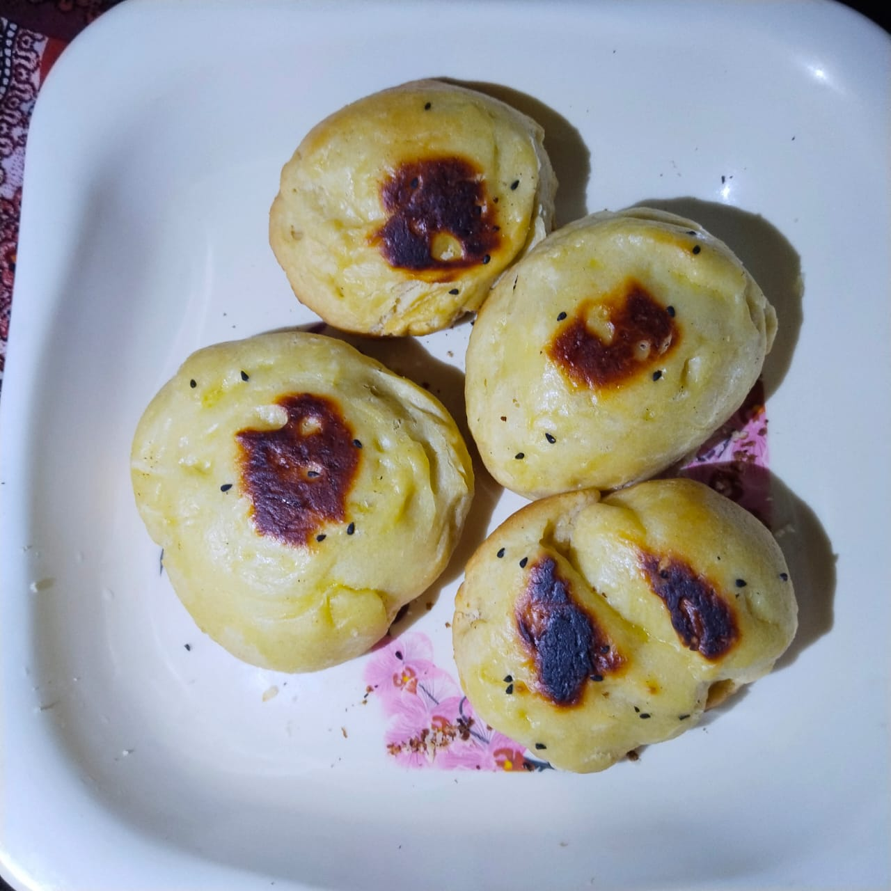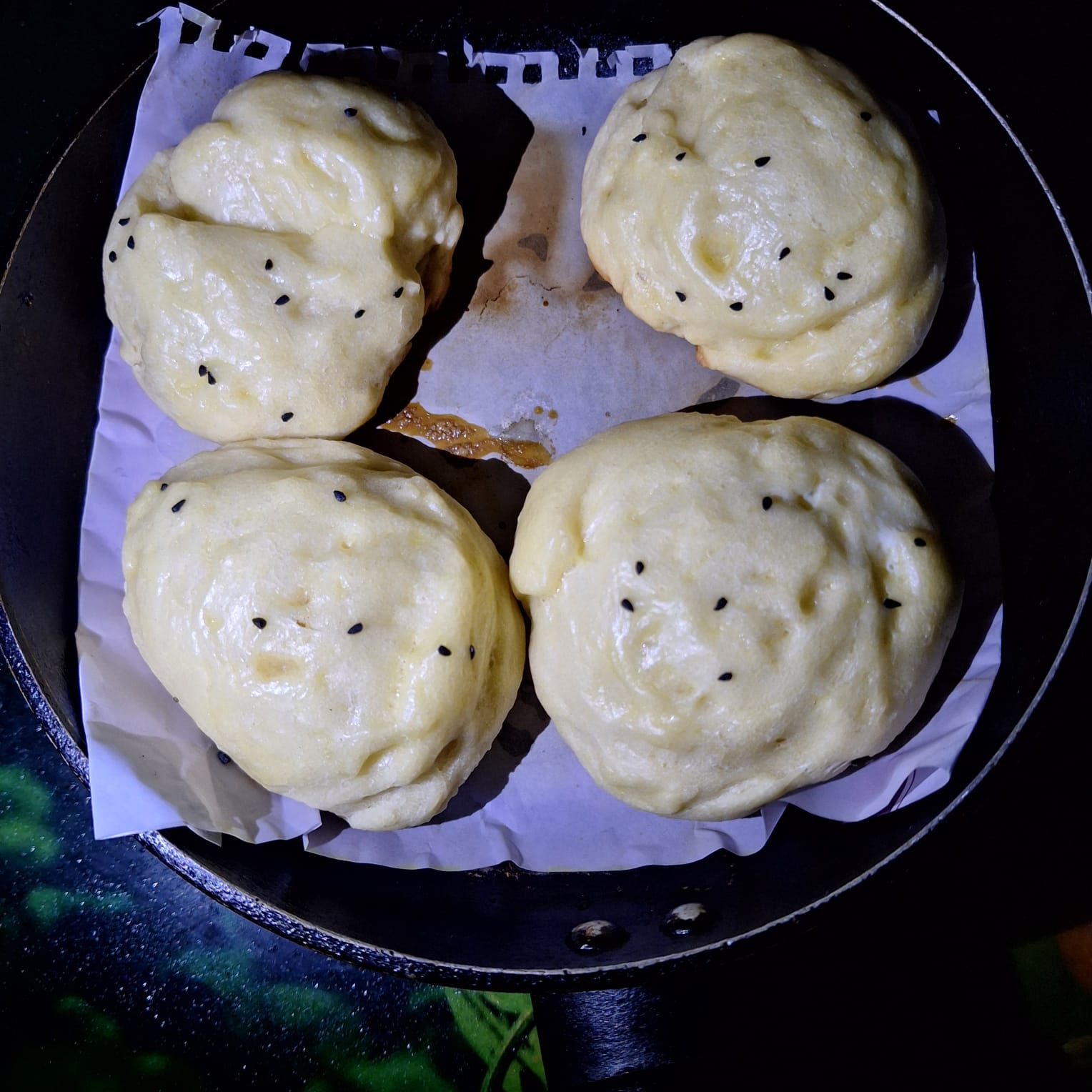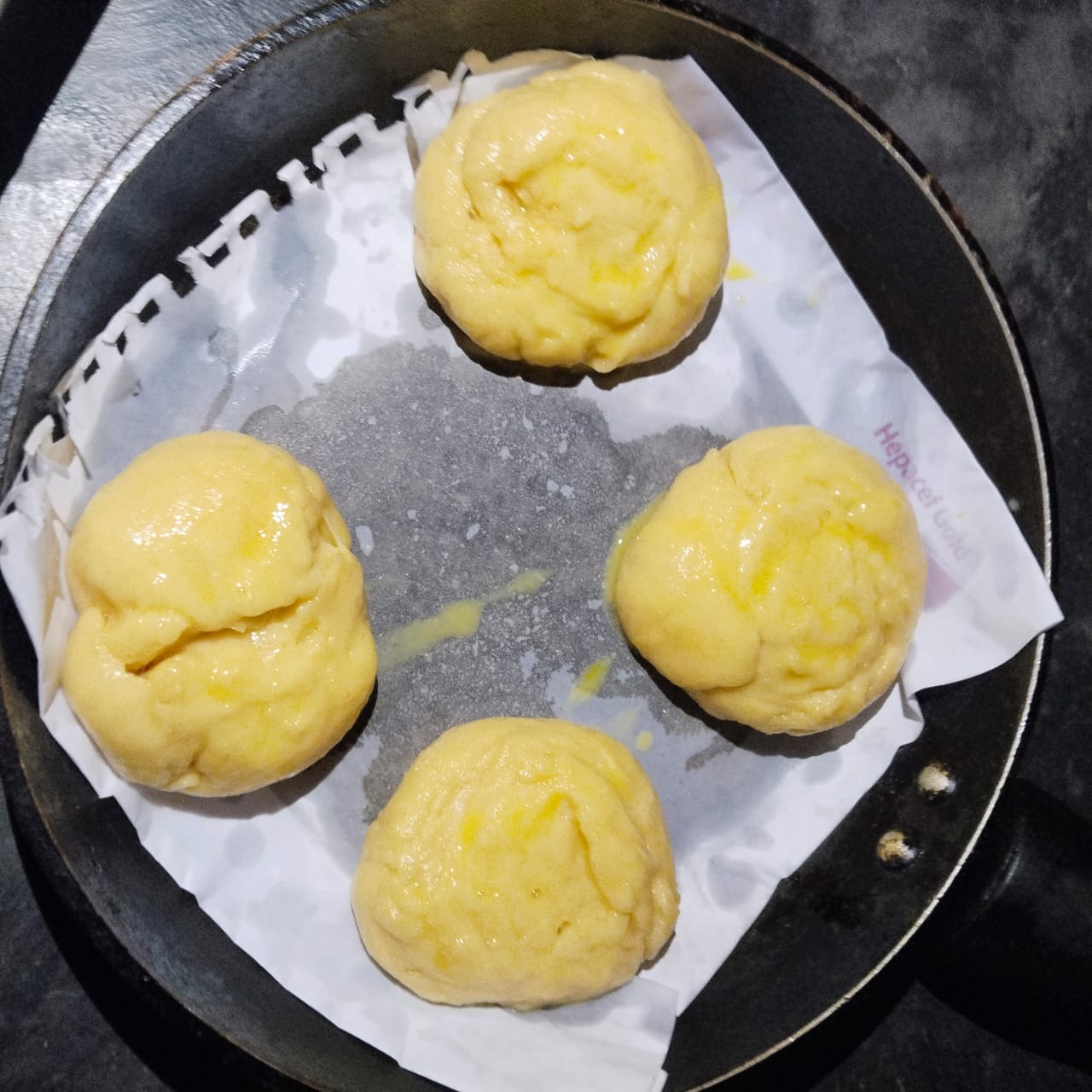 Step-6: Grease a paper with oil in a pan and then put the round buns on it, when serving I lightly brush it with egg and sprinkle some black cumin seeds on it. Then I cook it on low heat for 20 minutes. Since I don't have a microwave, I make it on the stove.