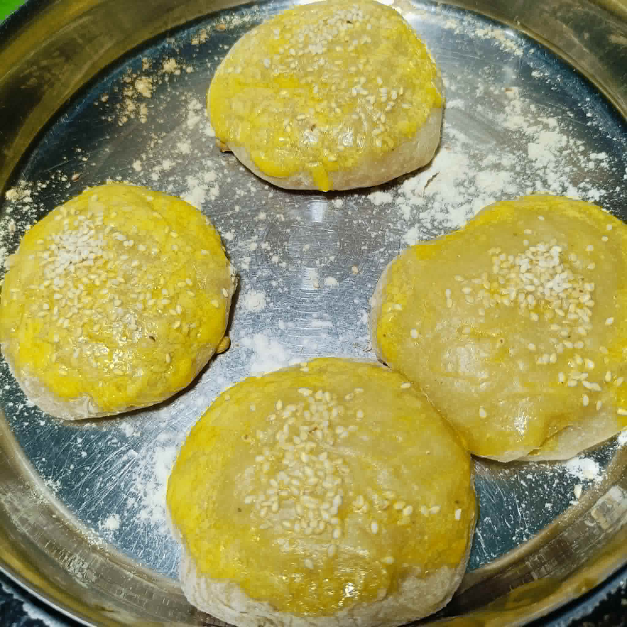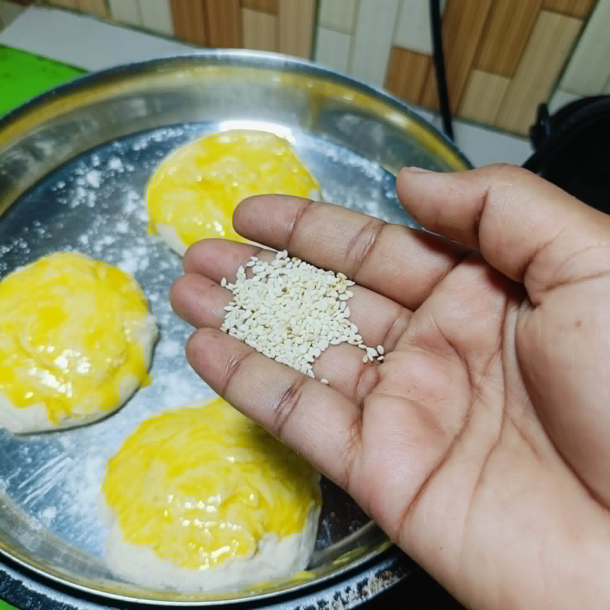 🍞Then I will take white sesami here, take sesame. Then, sprinkle the sesame seeds evenly over the four buns.