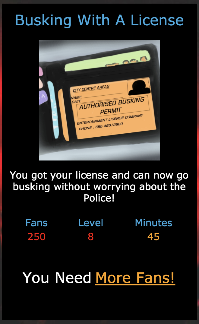 As you can see you will need to be a regular player to reach the level required to go busking with a license!!
