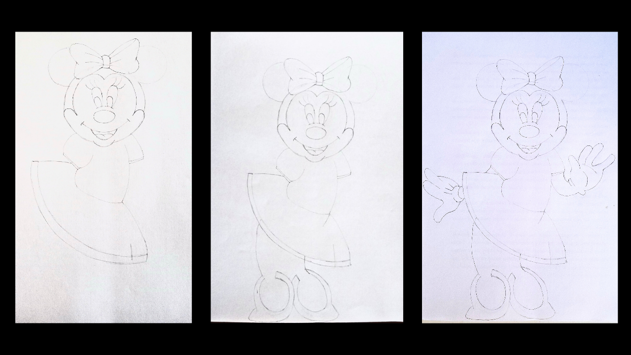 Luego de finalizar la cara, dibujé el cuerpo de Minnie, comenzando por el torso, las piernas, pies y por último los brazos y manos. De esta forma, culminé el boceto del dibujo.