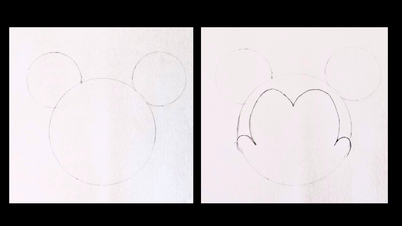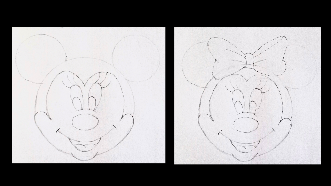 Comencé dibujando unos tres círculos, dos para las orejas y el más grande para la cabeza de Minnie. Después dibujé el contorno del rostro, haciendo un corazón incompleto, el cual continúa con un par de óvalos para las mejillas.
