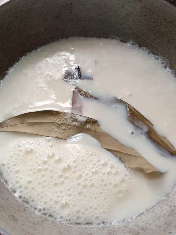 Next, I placed a pan on the stove. Once the pan was heated, I poured the milk into it. After boiling it a little, I added the required spices. The spices included one bay leaf, two small cinnamon slices, three cloves, and a small amount of salt for taste.
