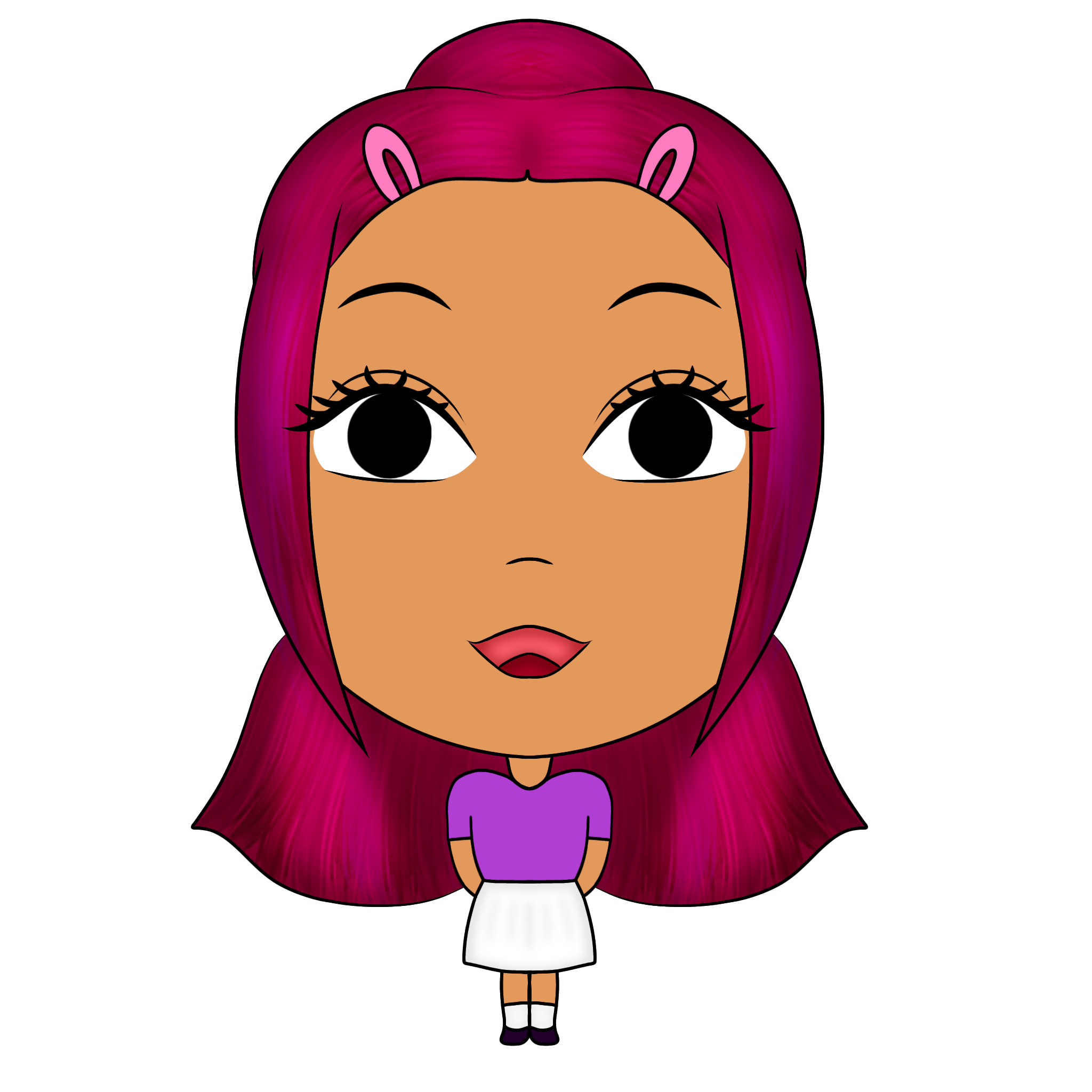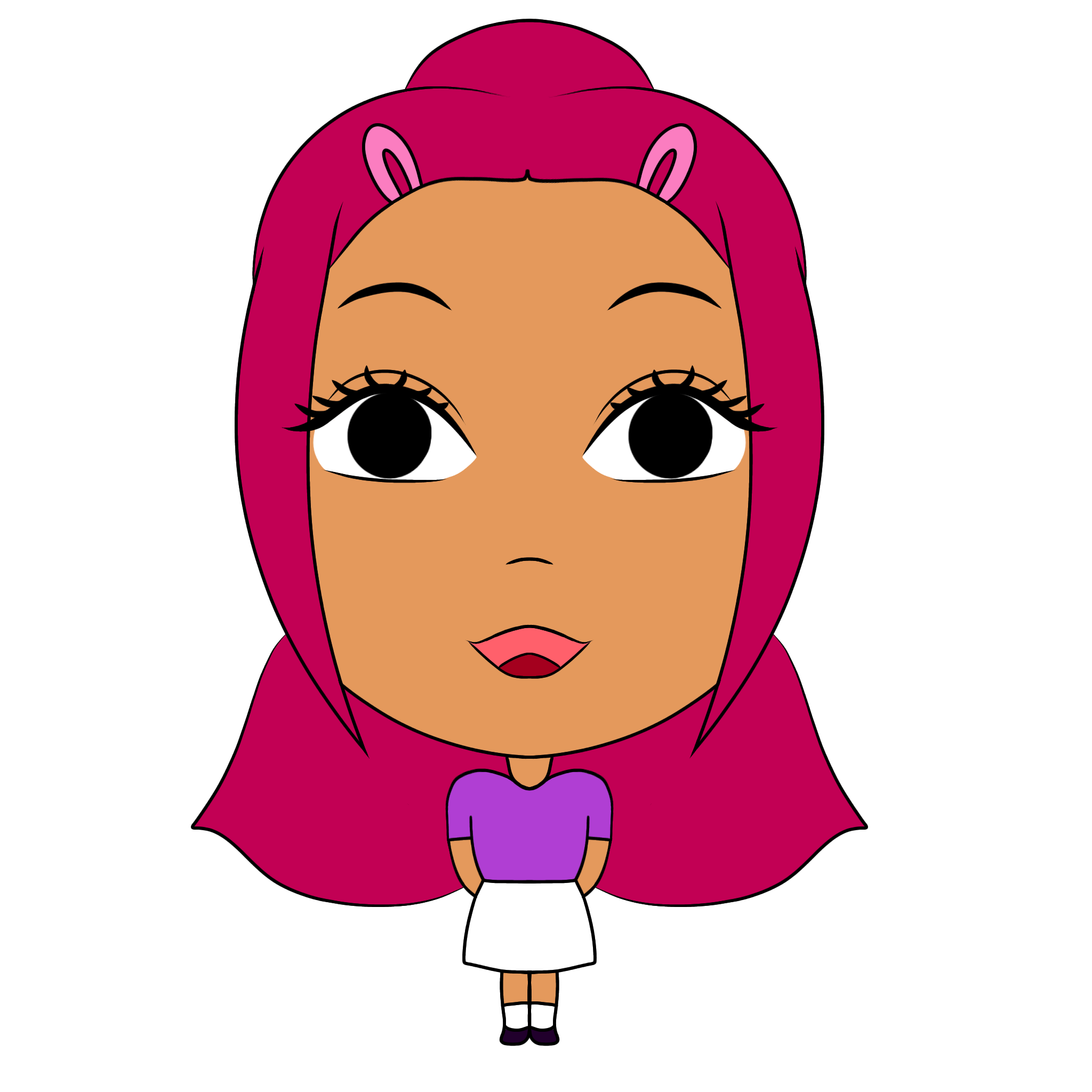 2. Añadí color al dibujo, utilizando un rosado oscuro para el cabello, morado para la camisa, rosado para los pequeños ganchitos del cabello, rojo y rosado para la boca y negro para sus zapatos. Para la piel, opté por un marrón claro.