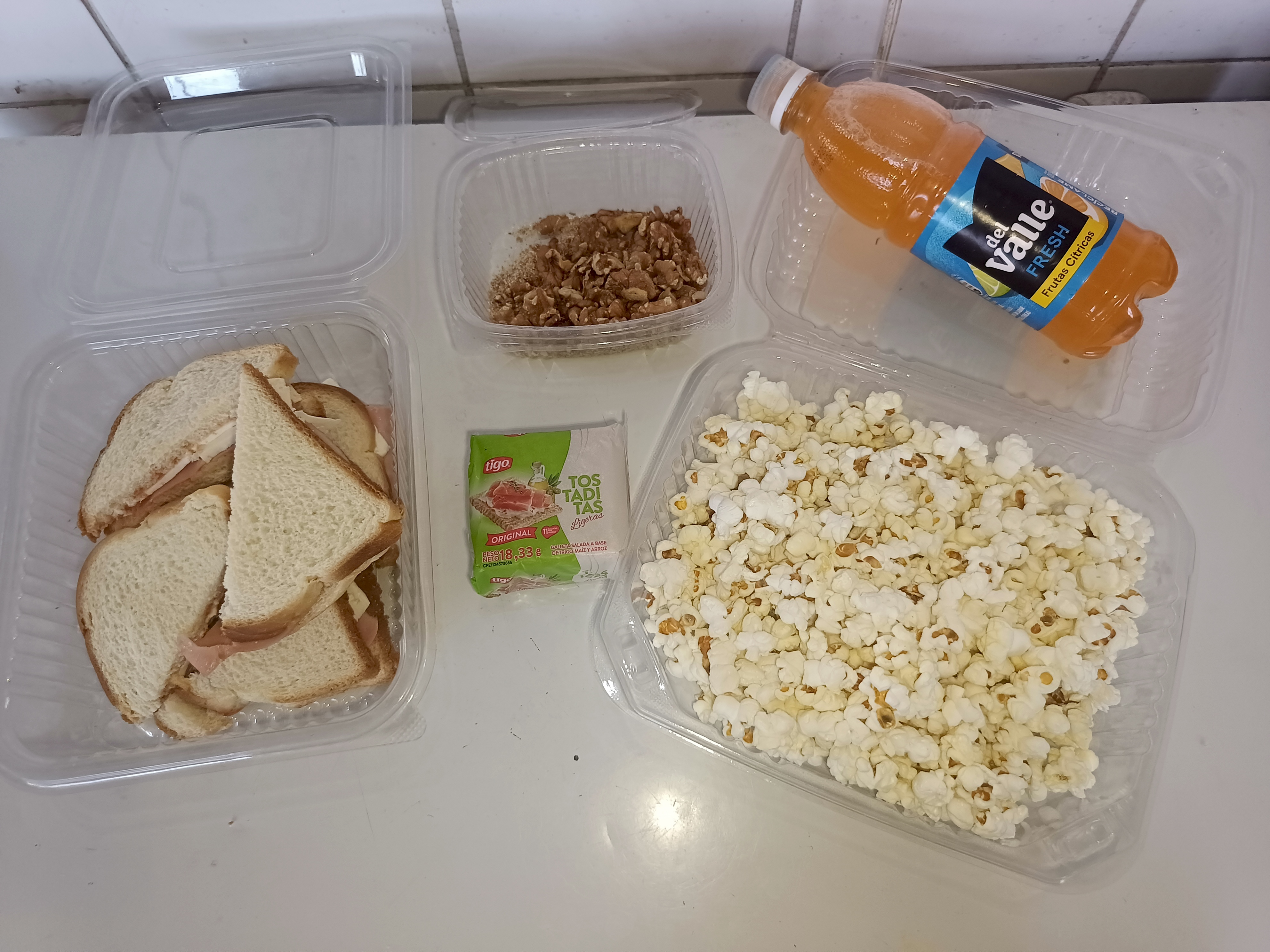 Bueno antes de salir de casa preparé unos sandwiches de jamón y queso para llevar y compartir, también hice palomitas de maíz 🍿 que es un snack delicioso y muy fácil de hacer, además mi mamá había hecho suspiros y los llevé, galletas y frutos secos que son los favoritos de mi mamá y un juego de naranja, esa fue nuestra para llevar