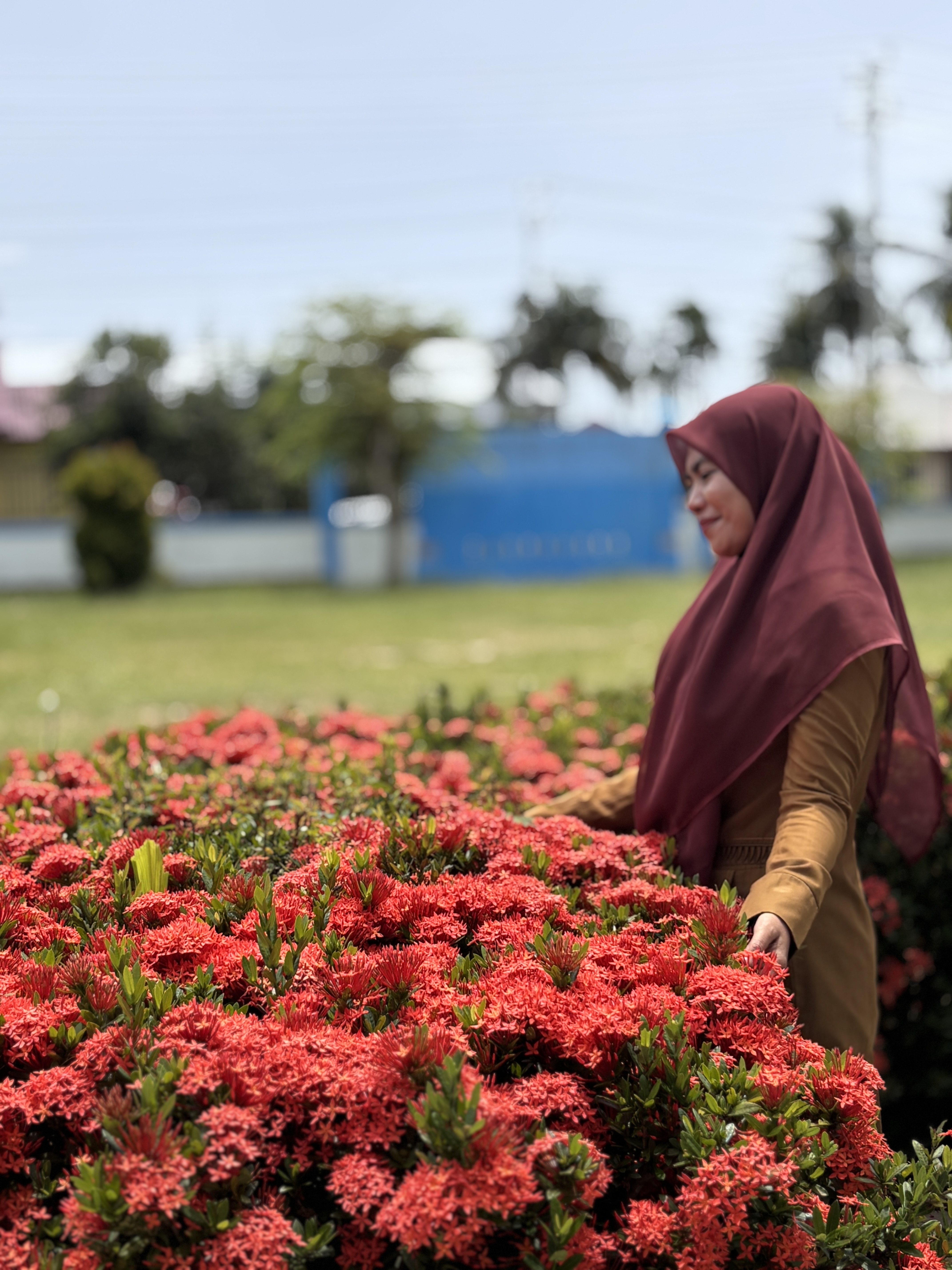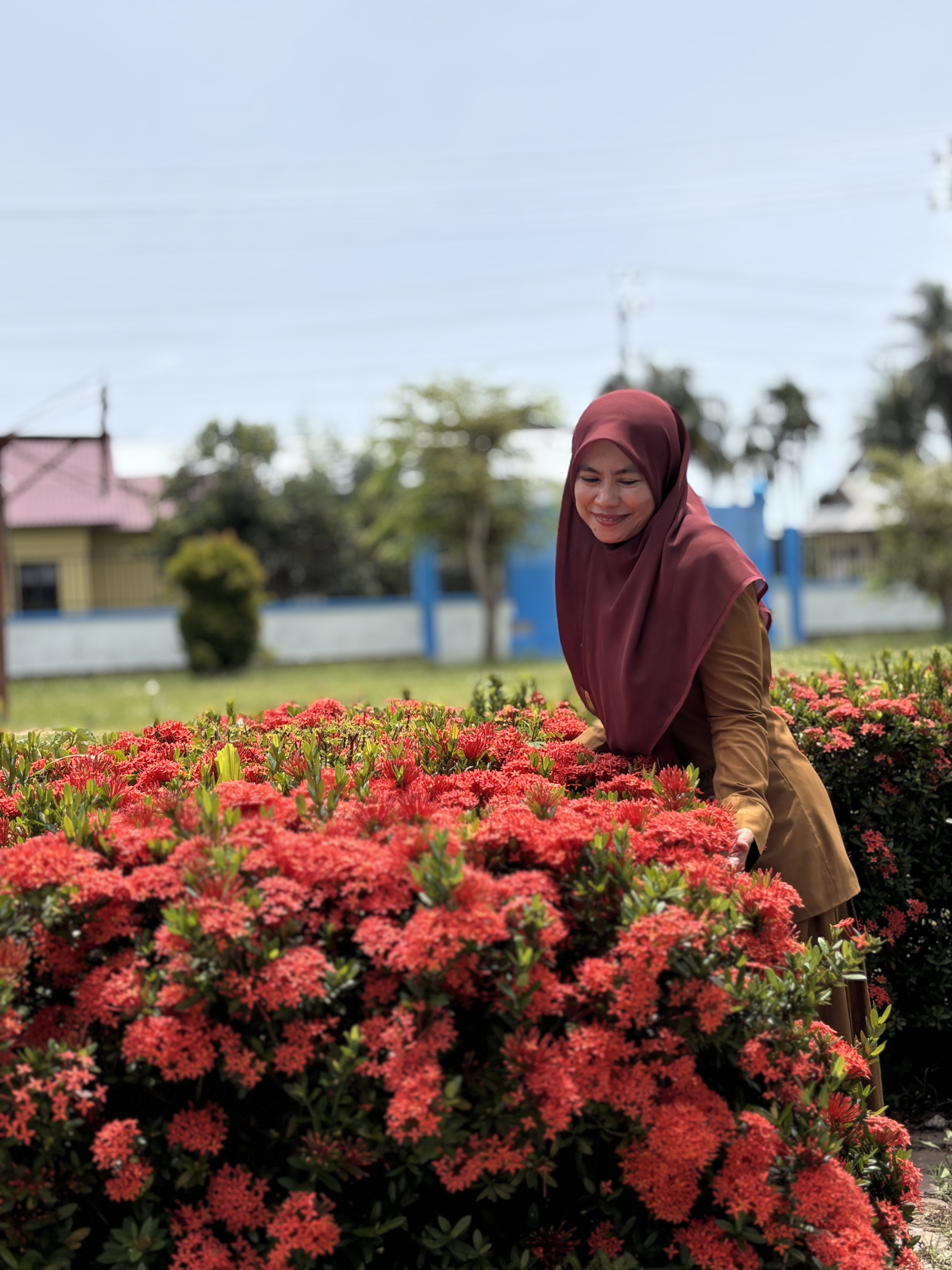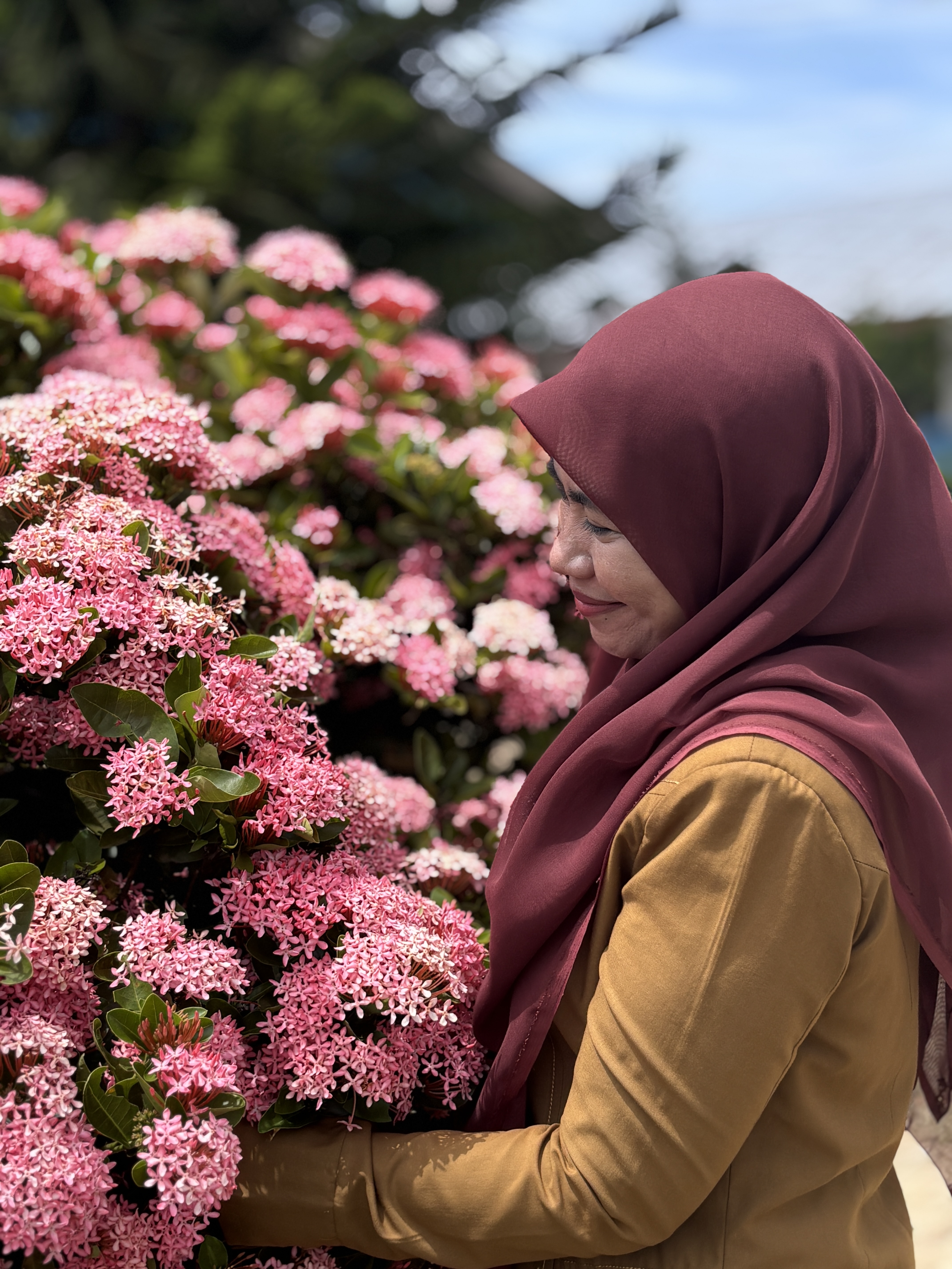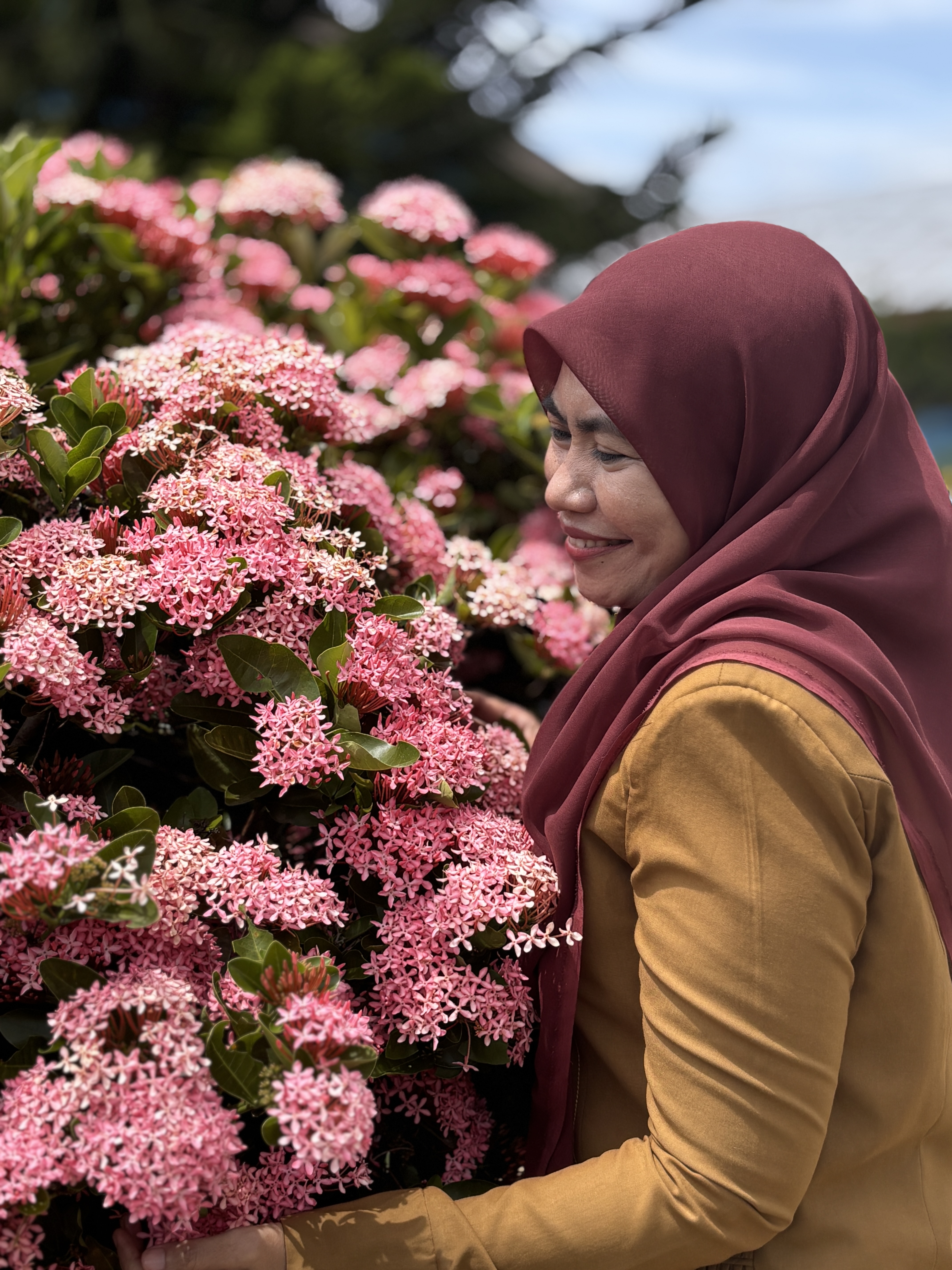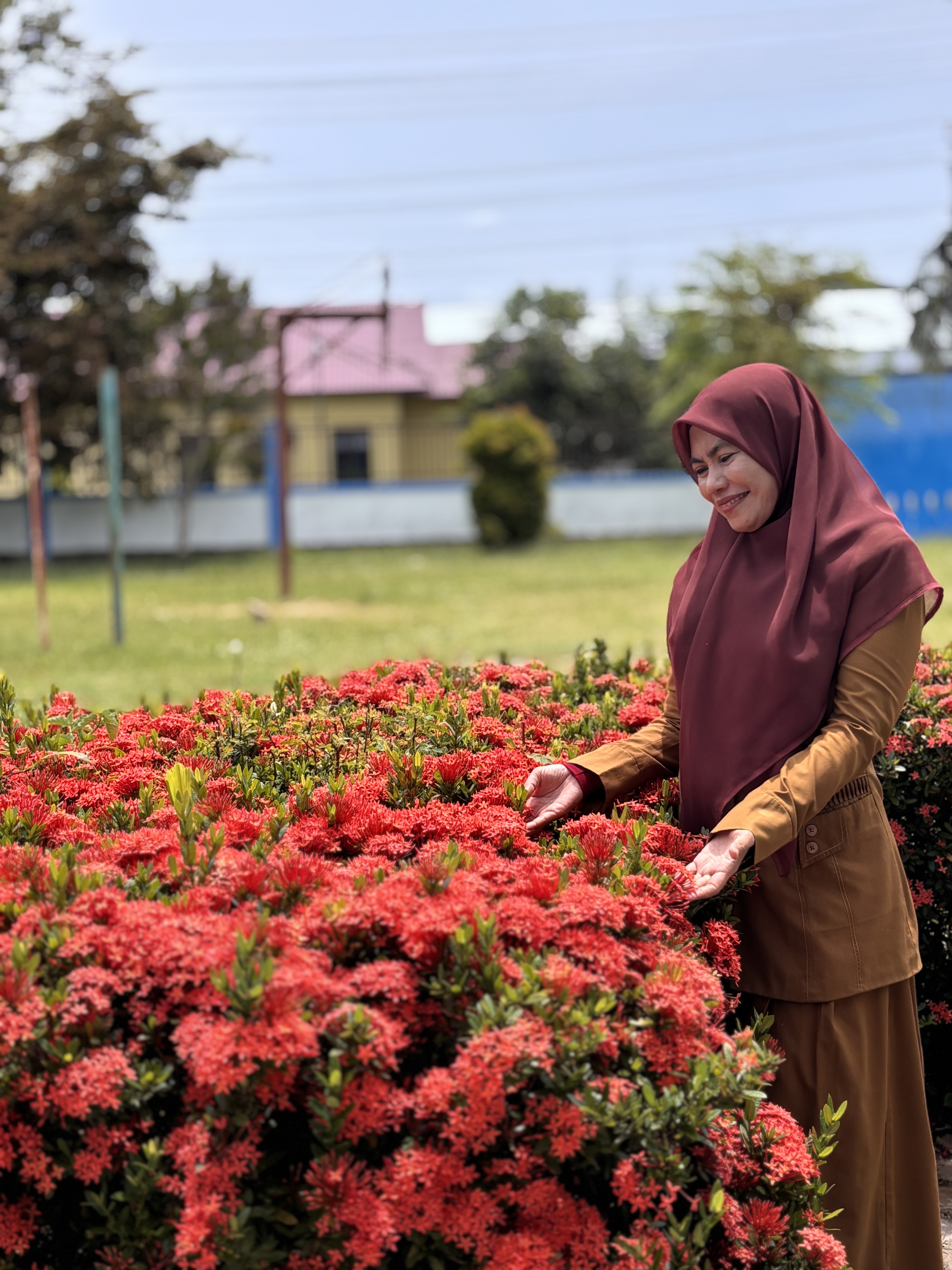 Selesai upacara barulah para siswa bubar menuju ke kelas masing-masing untuk melanjutkan aktivitas pembelajaran lagi. Suasana sekolah tempat aku mengajar terlihat asri dengan tanaman di pekarangan dan taman sekolah yang bermekaran. Langsung muncul hasrat dalam diriku untuk melakukan sesi foto di tempat bunga yang bermekaran indah. Bunga-bunga tersebut adalah bunga asoka berwarna pink dan merah. Terlihat sangat memukau mata.