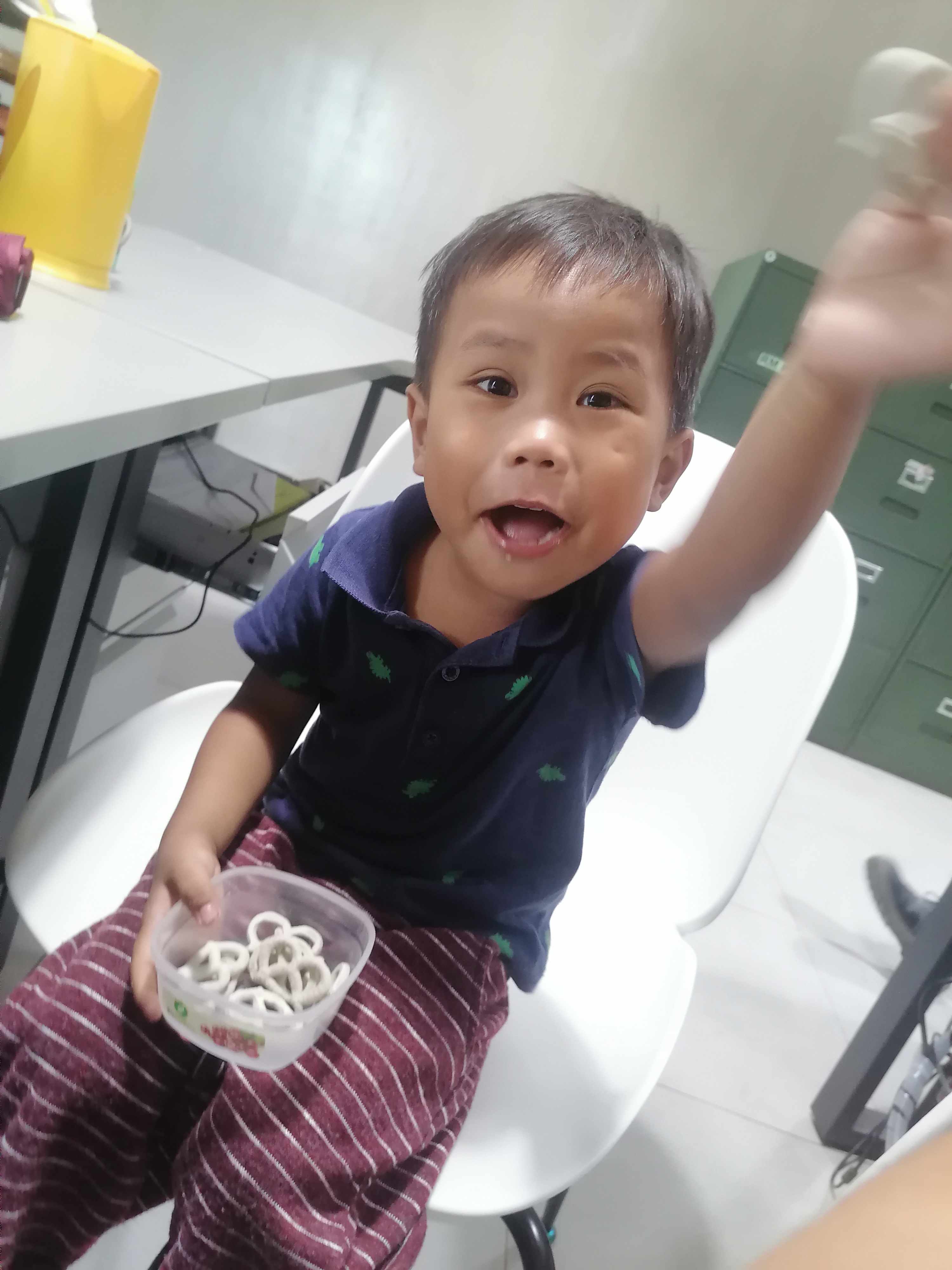 He is very excited to eat the food we bought, he was actually asking for it while still in the vehicle but he is very patient to wait until we reached my workplace.