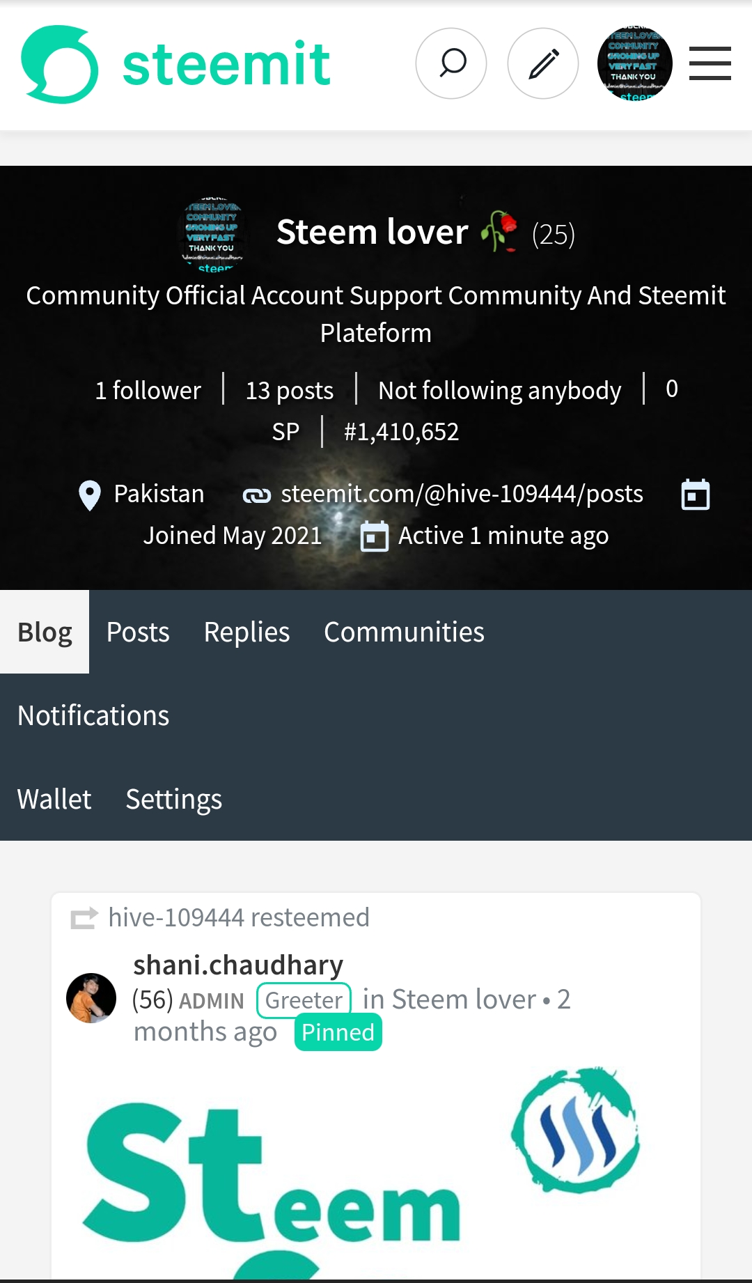 Admin @shani.chaudhary and @hive-109444 Official Community Steem lover Account.