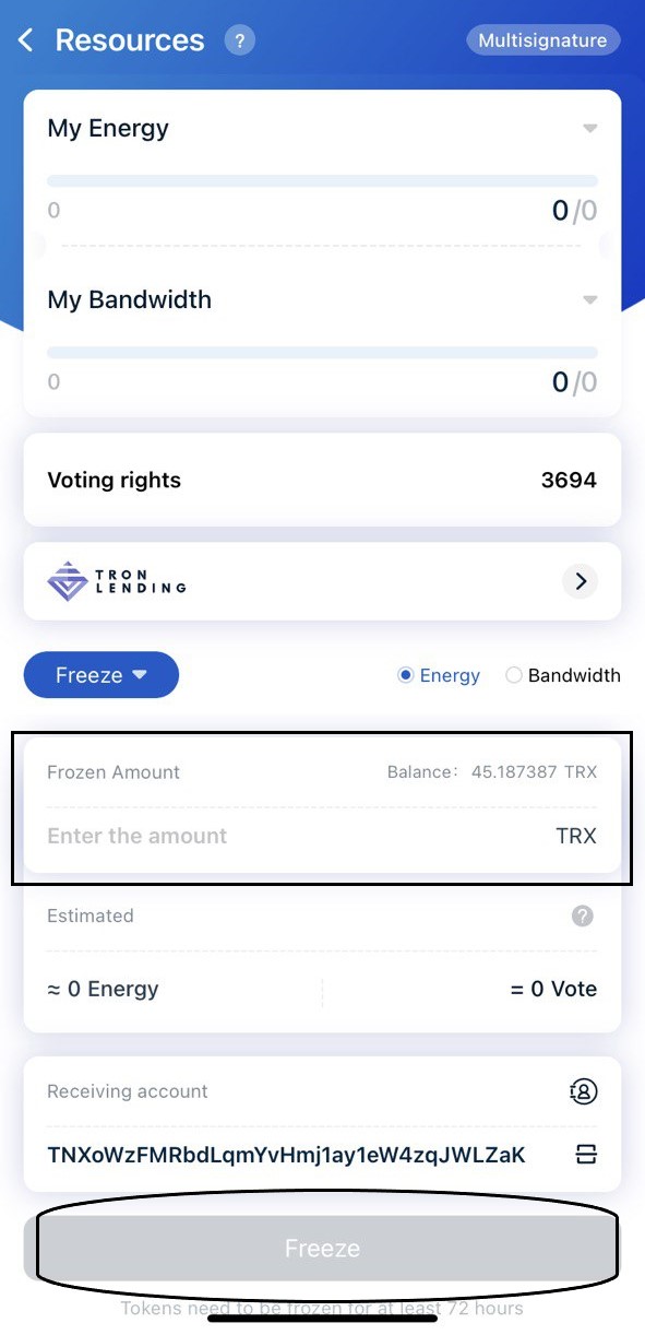 - At the freeze option you may freeze your tron in bandwidth or energy. Either of them will make it possible for you to stake and get some returns on them. You are going to need your password to verify the process once the number for freezing is entered.