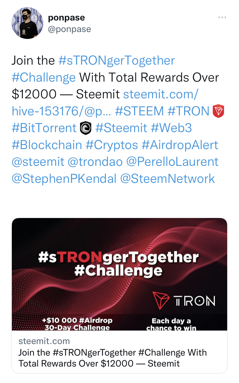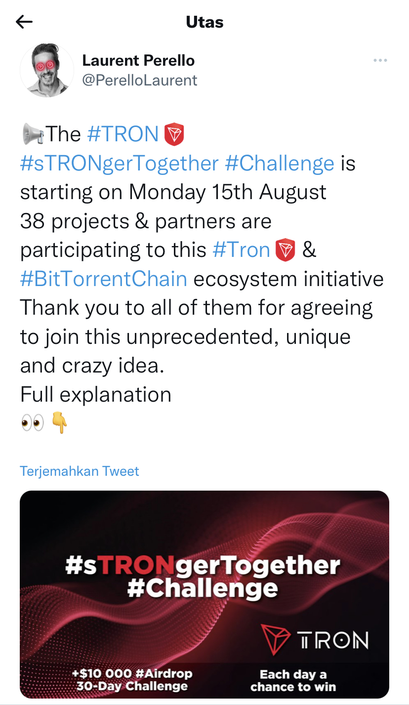 In this post I want to promote a campaign program run by Laurent Perello, an Adviso TRONDAO via Twitter. The campaign or demonstration is called the #sTRONgerTogether #Challenge. Laurent Perello has officially announced the demonstration project via his Twitter account, @PerelloLaurent.
