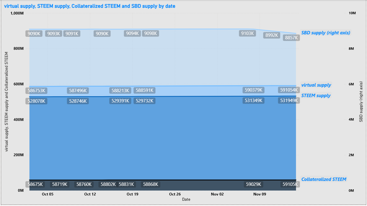 - There is no apparent change in slope for the virtual STEEM supply, the current STEEM supply, or the number of collateralized STEEM (left axis).