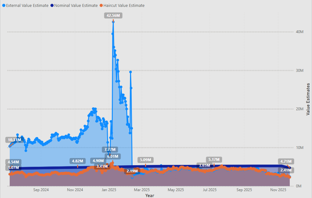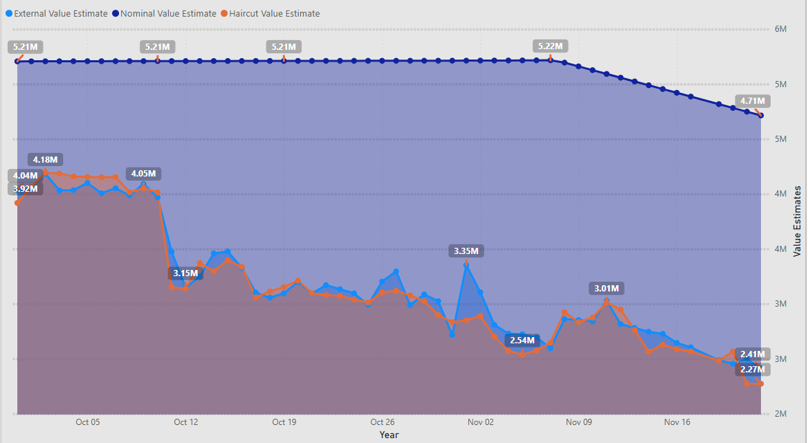 When proposal #116 from @blaze.apps launched, the haircut price was around $0.153. Last week it was $0.149627, and today it is $0.14534. My baseline expectation was that it would be around $0.138 at the end of the 30 days, and that still seems to be a reasonable guess.
