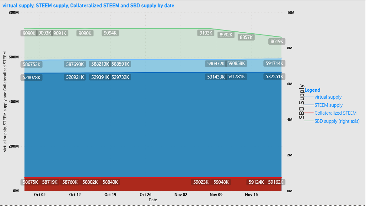 - The STEEM virtual supply, current size, and collateralized STEEM are all scaled against the left axis.