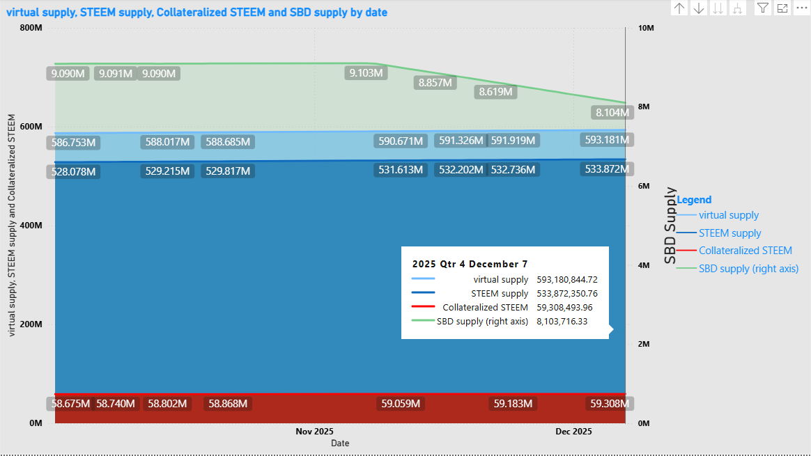 - The virtual supply, current size, and collateralized STEEM are all scaled against the left axis.
