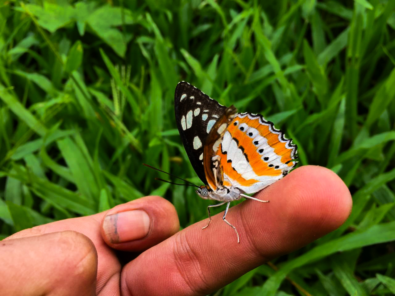 Then after that, I waited for my friend to water the chili seeds. While I was sitting on the grass, a butterfly approached me and landed on the grass in front of me.