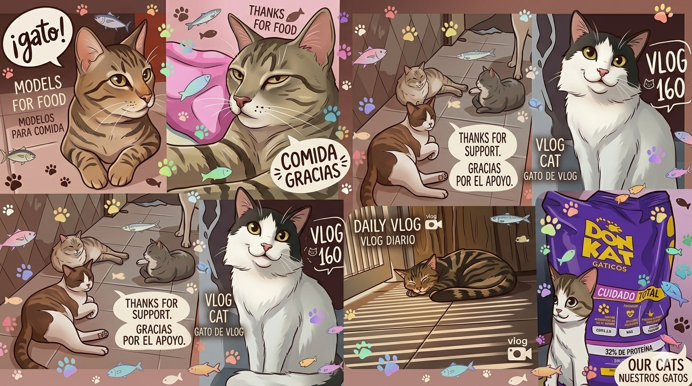 They also really like chicken gizzards and fish, and sometimes we vary their diet. This post is to thank you and show you the six cats present. As you can see, we've added voiceovers to the videos, which I think the audience likes, and that makes us very happy. Until next time, until the next episode of Your Cat!