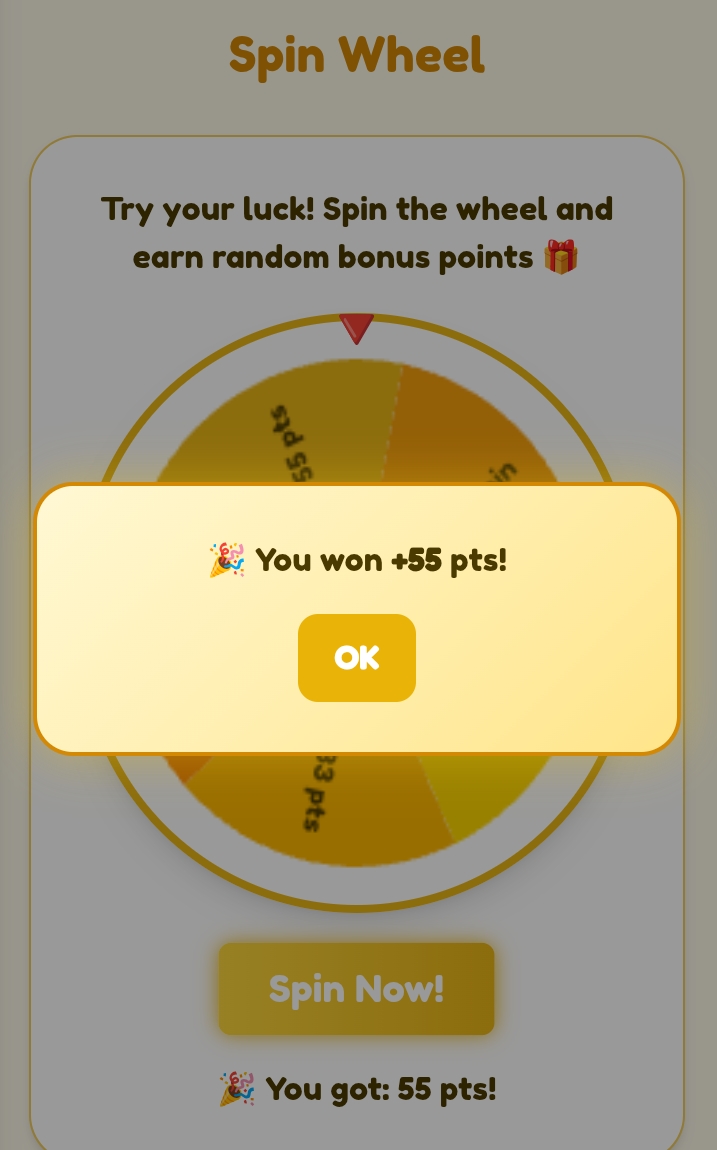 You can earn some points here by spinning. I earned a total of 55 by spinning here, which is really amazing.