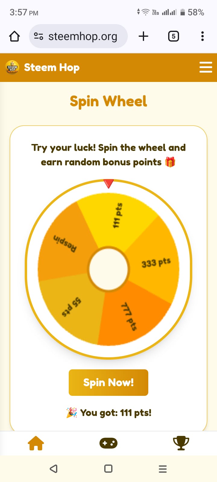 Then I clicked on the option called Spin Wheel and spun the wheel and achieved 111 points.
