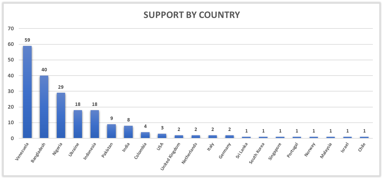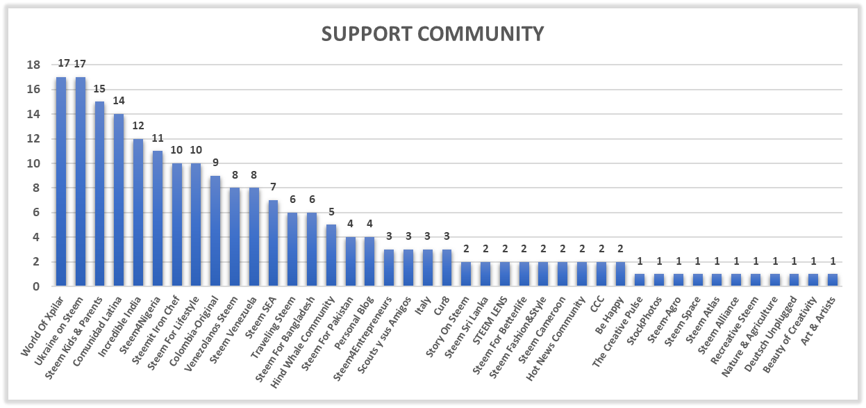 We now present the number of users according to their "nationality" that were supported by the Steemcurator06 account during this period.
