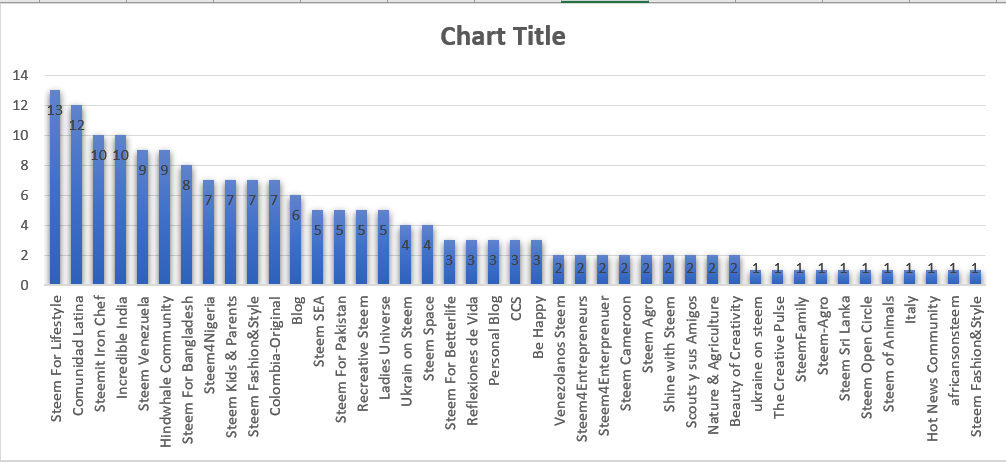 Our team has curated 43 communities, including the Blog. The first-place community is Steem For Lifestyle, the second-place community is Comunidad Latina, and the third-place community is Steemit Iron Chef.