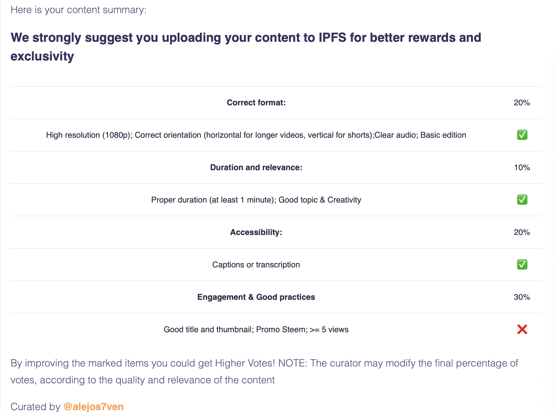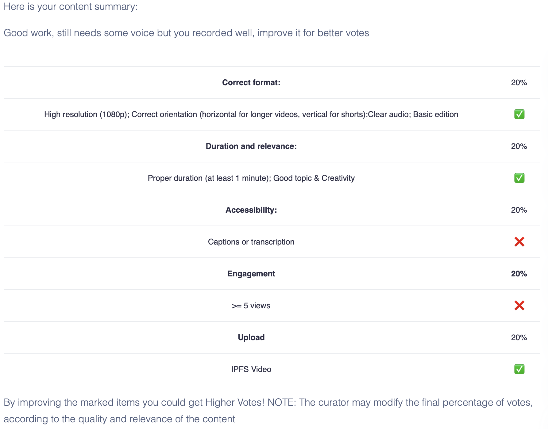 In the end, only extremely good videos will receive up to 100% upvote if they are IPFS or 80% if they are YouTube. You can work harder to get that. This will be a testing phase of this system and is based in community requests to include certain things in the videos.