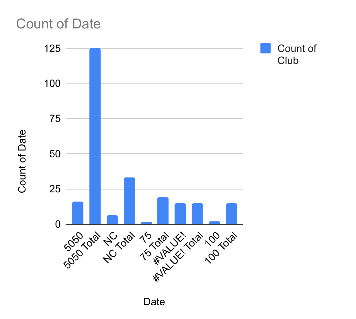 When we visited, we found that the most clubs I found were Club5050 - 125, club100 - 15. club75 - 19 and NC 33.