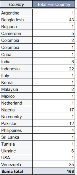 For this week, a total of 21 countries were visited by the team, with Bangladesh topping the list, followed by Venezuela, Indonesia, and Nigeria, respectively.