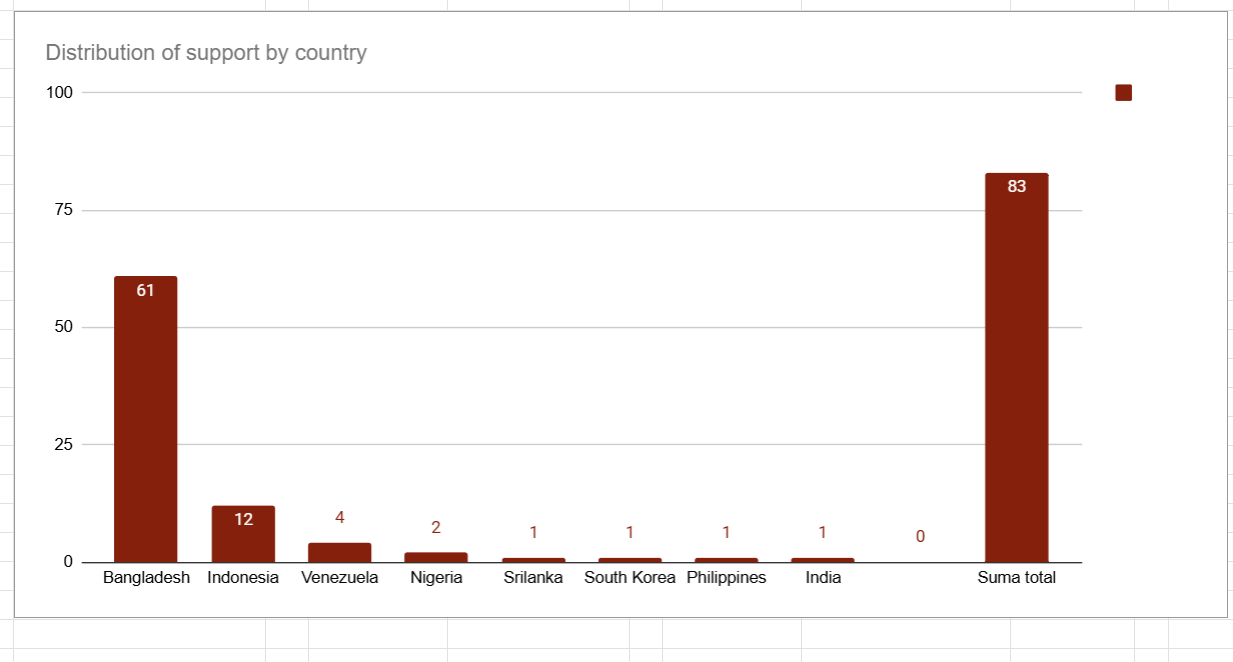 We could curate posts across 8 countries covering different continents. Bangladesh leads the chart by far with 61 posts, and there is one other country with double-digit posts: Indonesia.