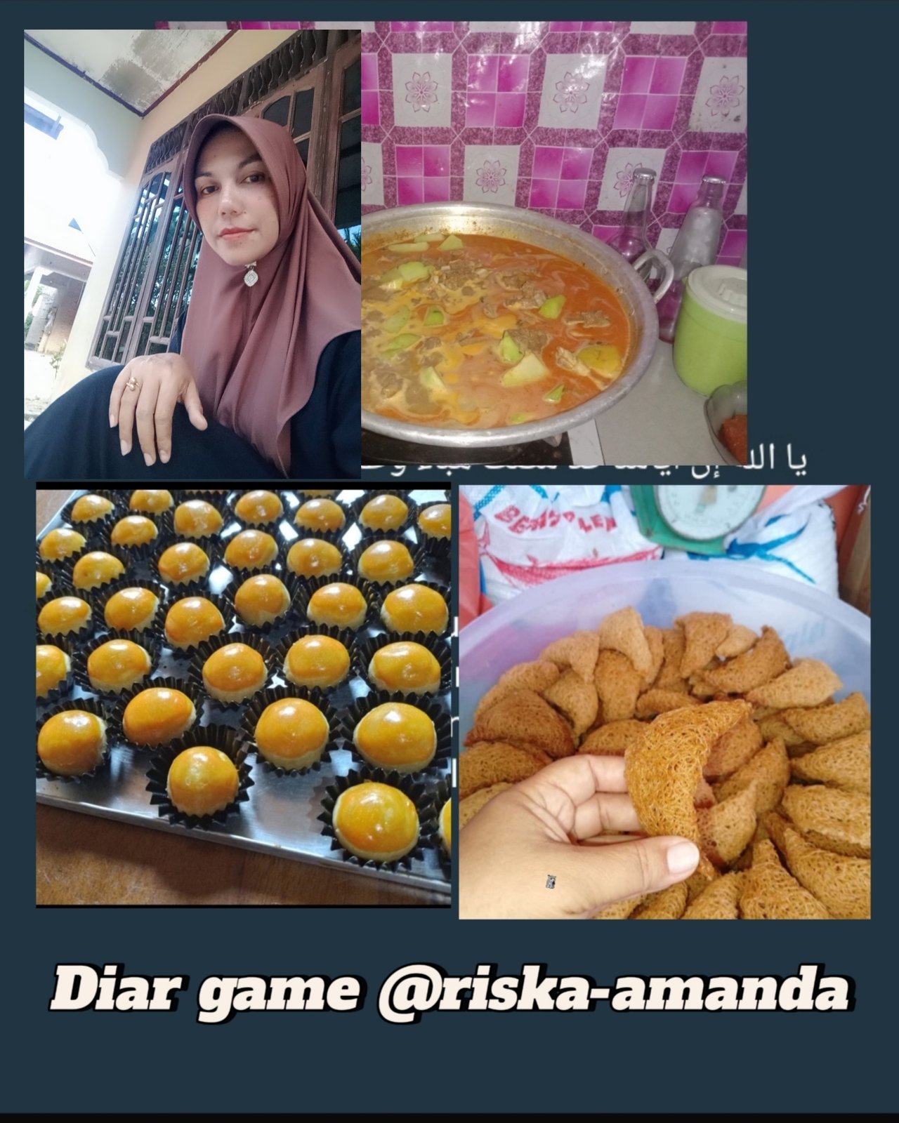 This week @riska-amanda wrote a very good Diary game, starting from dawn, she woke up to prepare saur food, then she cleaned the house, watered the plants behind the house and prepared Eid clothes for her daughter, then prepared orders for her customers who wanted to order Eid cakes, some kilo of nastar cake, risen cake, delicious crunch match, the price of each product is around IDR 70,000 / kg 1 SBD and 19 STEEM