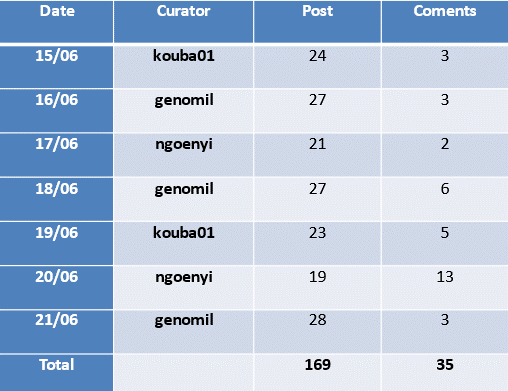 During this week, we have supported a total of 169 posts and 35 comments. Each team member has completed their work on the designated days, as evidenced in the following table.