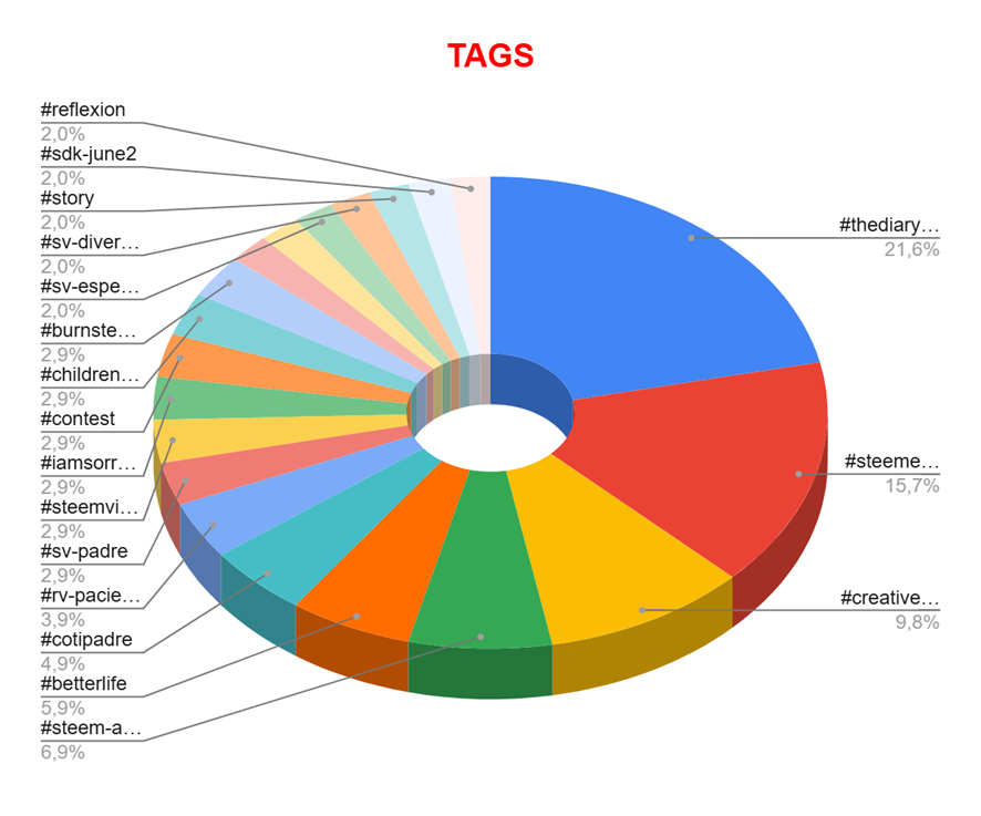 This week's top hashtags are reflected in the following graph. The top hashtags of the week are #thediarygame, #steemexlusive, and #creativewriting.