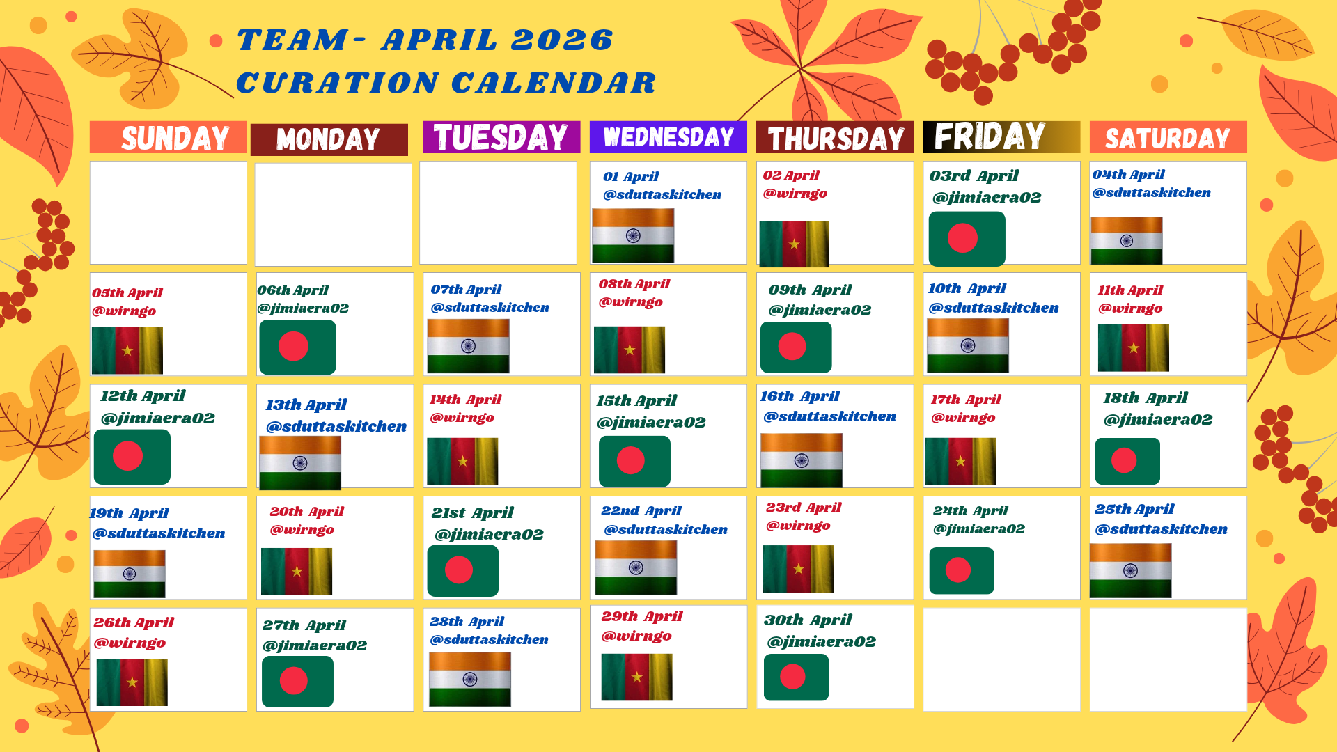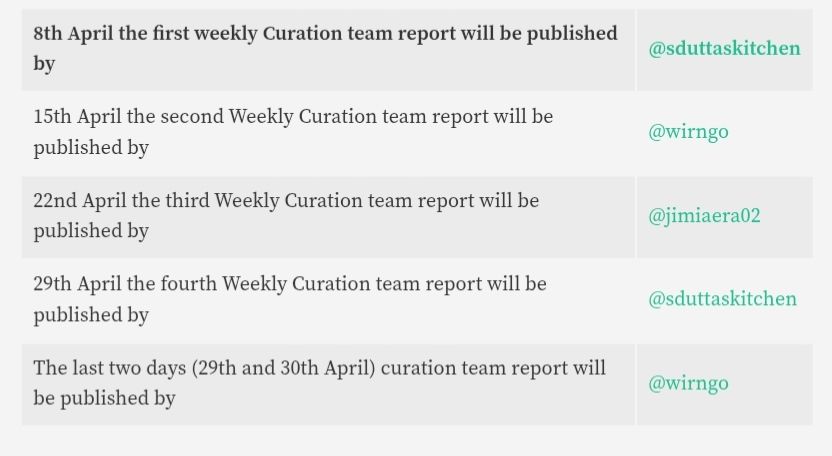 √ Our curation schedule will run as tabulated below: