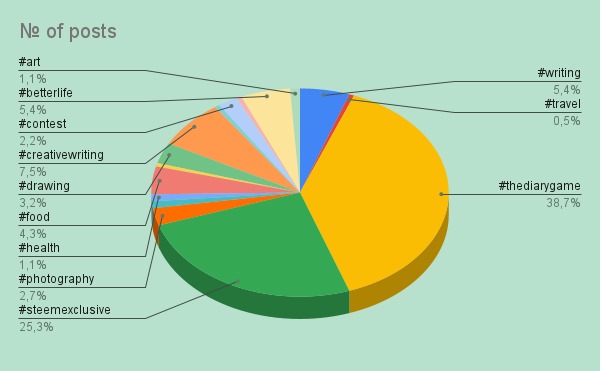 With 16 tags visited, thediarygame had the most tags 72, followed by steemexclusive 47, food 8, creativewriting 14 and other tags.