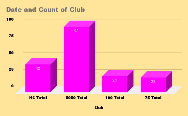 When we visited, we found that the most clubs I found were Club5050, which numbered 98, club100 24. club75 - 22 and NC only 42.