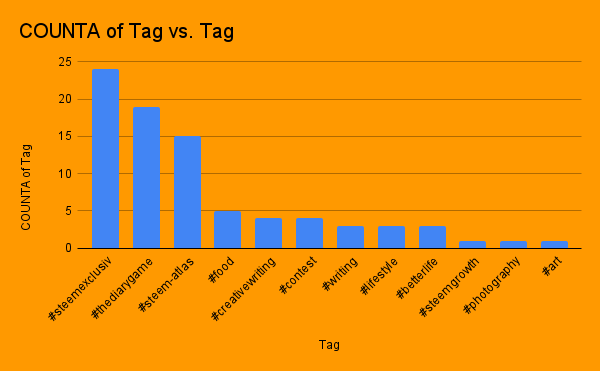 With 12 tags visited, thediarygame had the most tags 19, followed by steemexclusive 24, steem-atlas 15, food 05 and other tags.