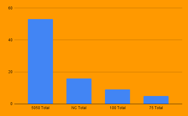 When we visited, we found that the most clubs I found were Club5050 - 53, club100 - 09. club75 - 05 and NC only 16.