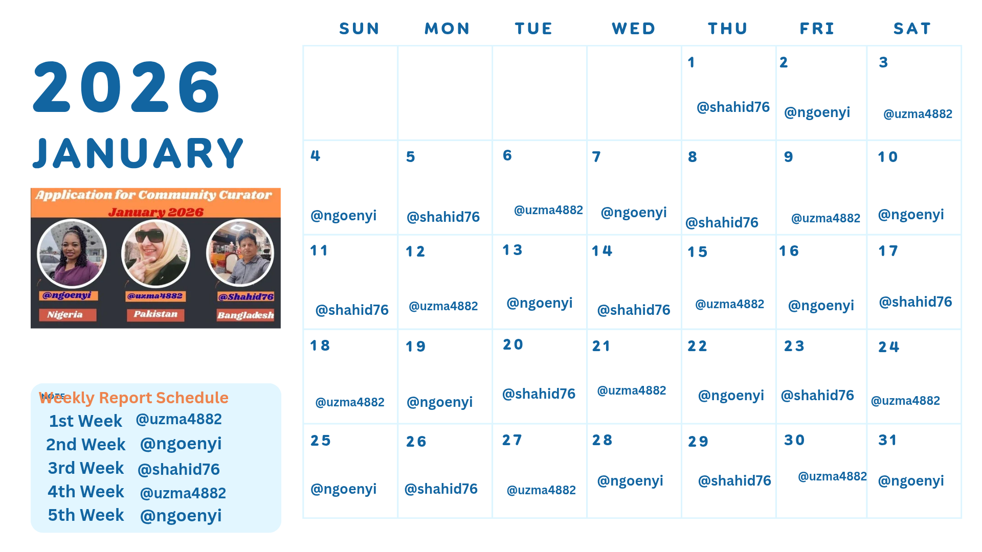 Our curation schedule will run as tabulated below