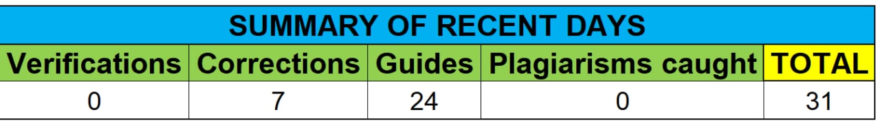 First, I want to set out a list of users and their respective achievements to which I made any suggestions about it before proceeding with the verification of the respective achievement. Some of these posts may have already been verified. Otherwise, we are waiting for users to proceed to edit or correct their posts to perform the subsequent verification of their achievements.
