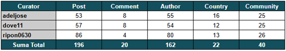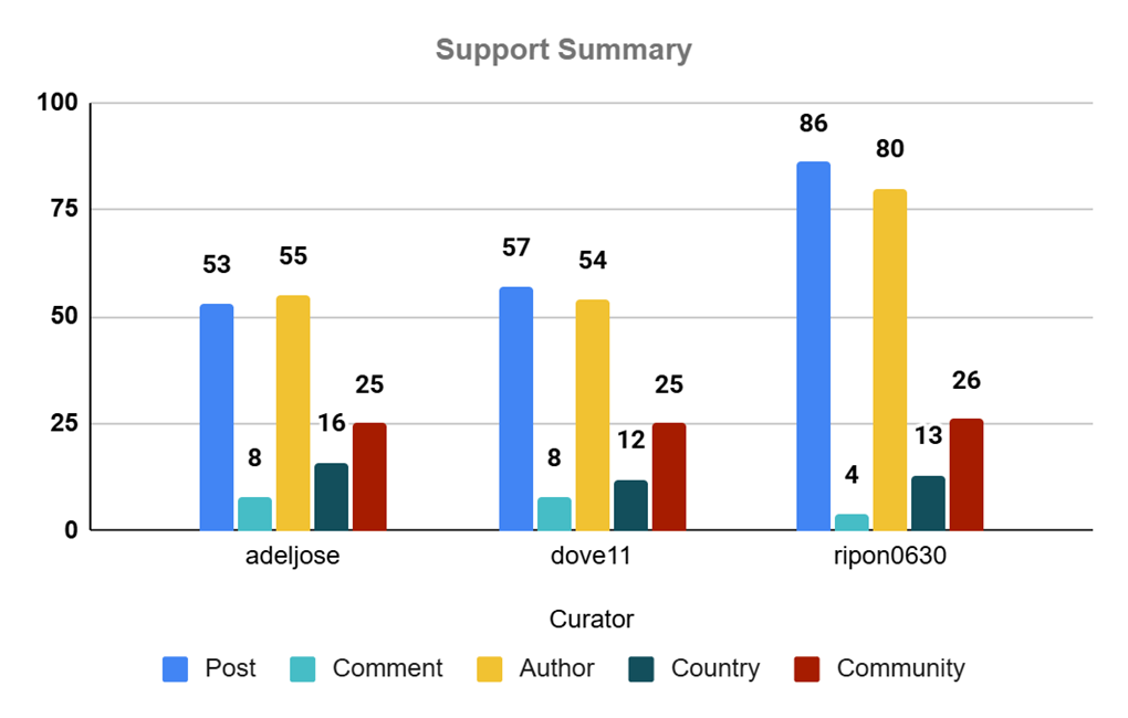 Our team consists of three curators. According to the schedule, ripon0630 has completed 3 day of curation, while the other two members have each completed two days of curation tasks this week. Together, we have successfully curated a total of 196 posts and supported 20 comments. We also managed to reach out to authors from 22 different countries and engaged with users across 40 different communities.