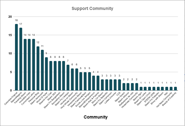 Our team has actively explored a wide range of communities to find the best quality content. This week, we have supported authors across 40 different communities. Colombia-Original community received the highest support with 18 votes, followed by Steem4Nigeria with 17 votes and Traveling Steem with 14 votes.