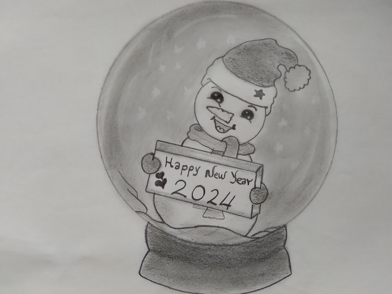 The user shows us how she can elaborate a beautiful drawing based on a snowman inside a glass bag using graphite pencil, using techniques to highlight lights and shadows, giving depth and achieving a beautiful result.