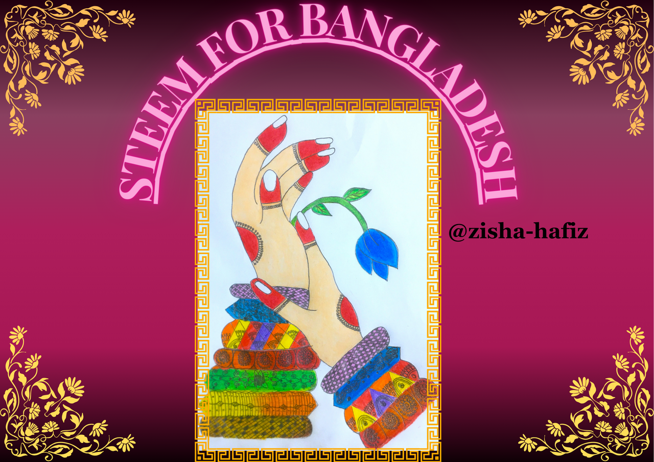 How she is so much talented and fantastic skills of art. I really impressed her astonishing tact's to sketch the women hands and filled the eye catching color's inside the hands and bangles. She really deserves highly appreciation on her outstanding creativity to draw a sketch of woman hand and doctored it beautiful colors along with bangles.